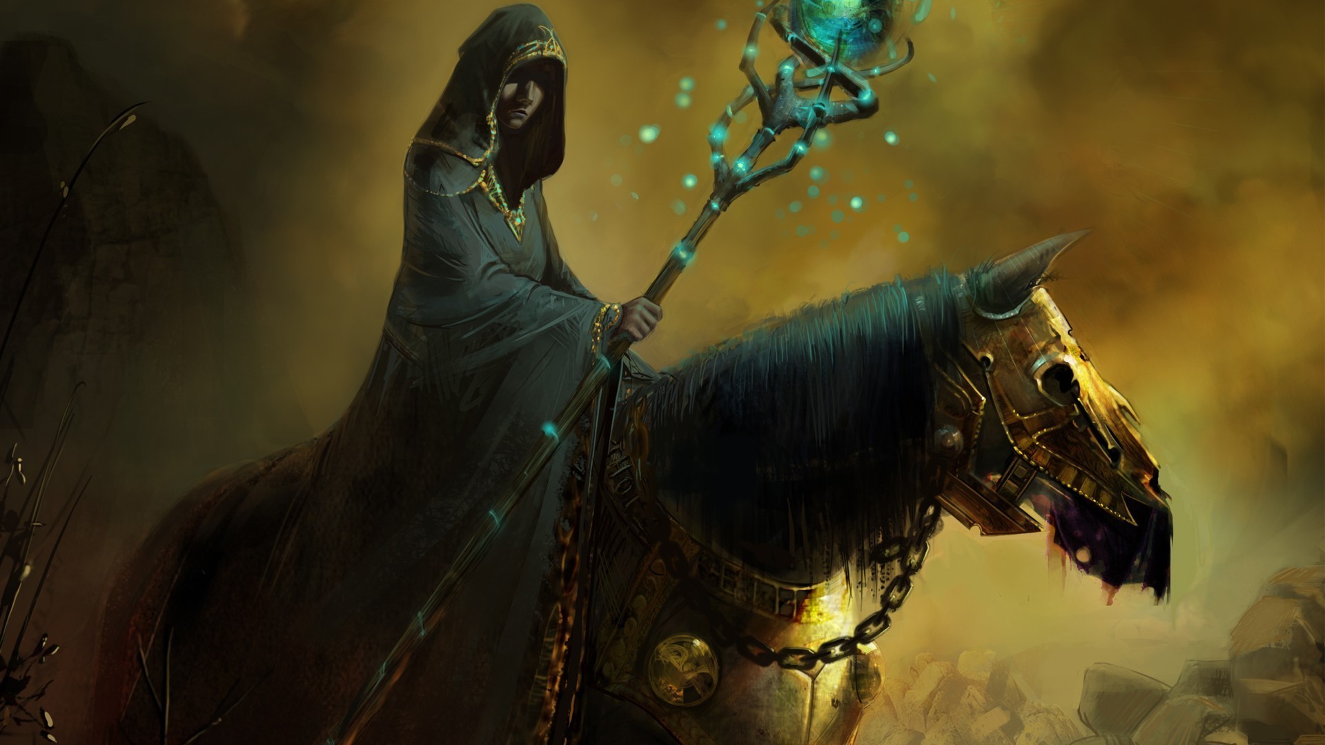 Ein Reiter reitet auf einem Pferd in Rüstung