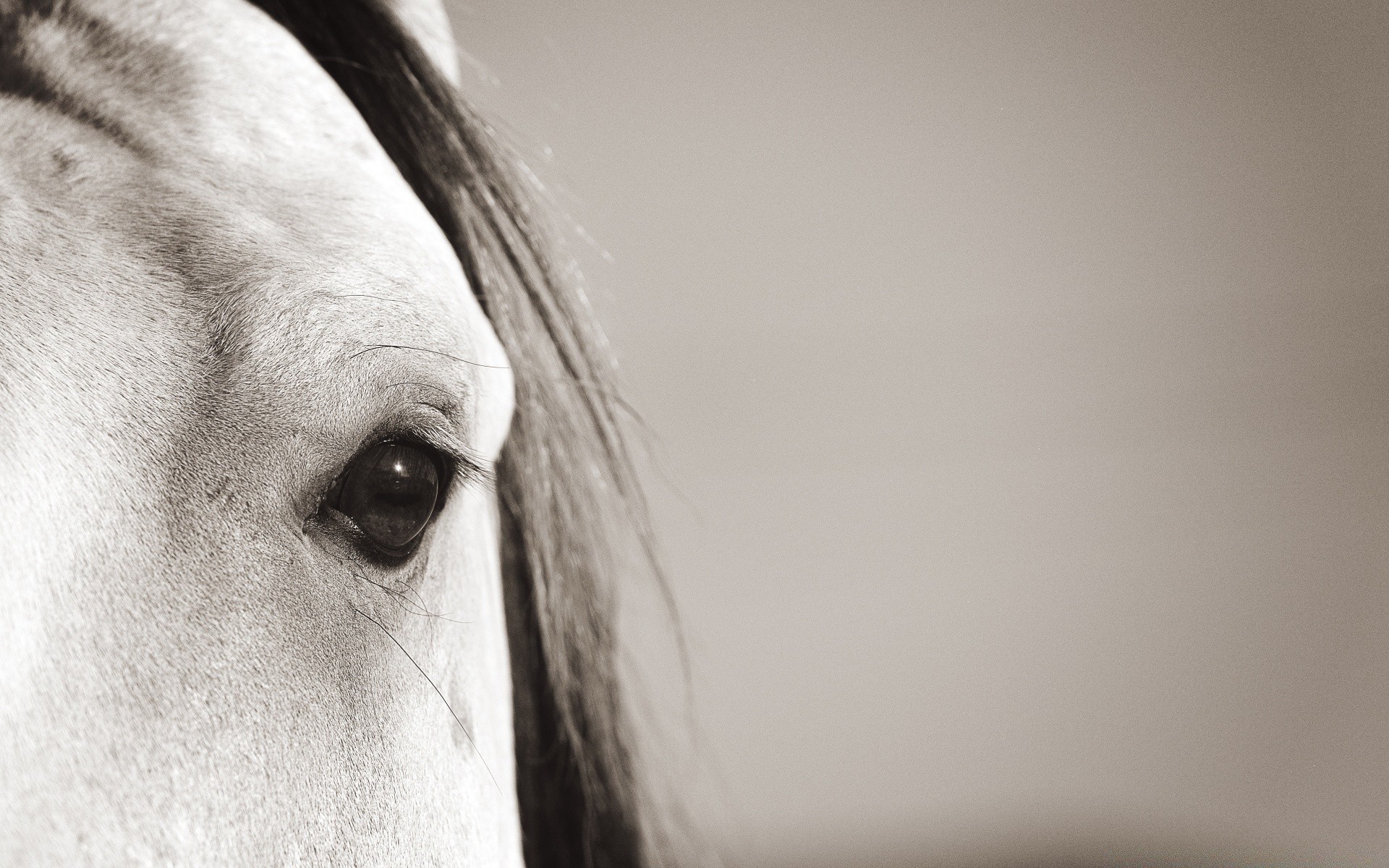 Schwarz-Weiß-Porträt eines Tieres. Das Auge des Pferdes