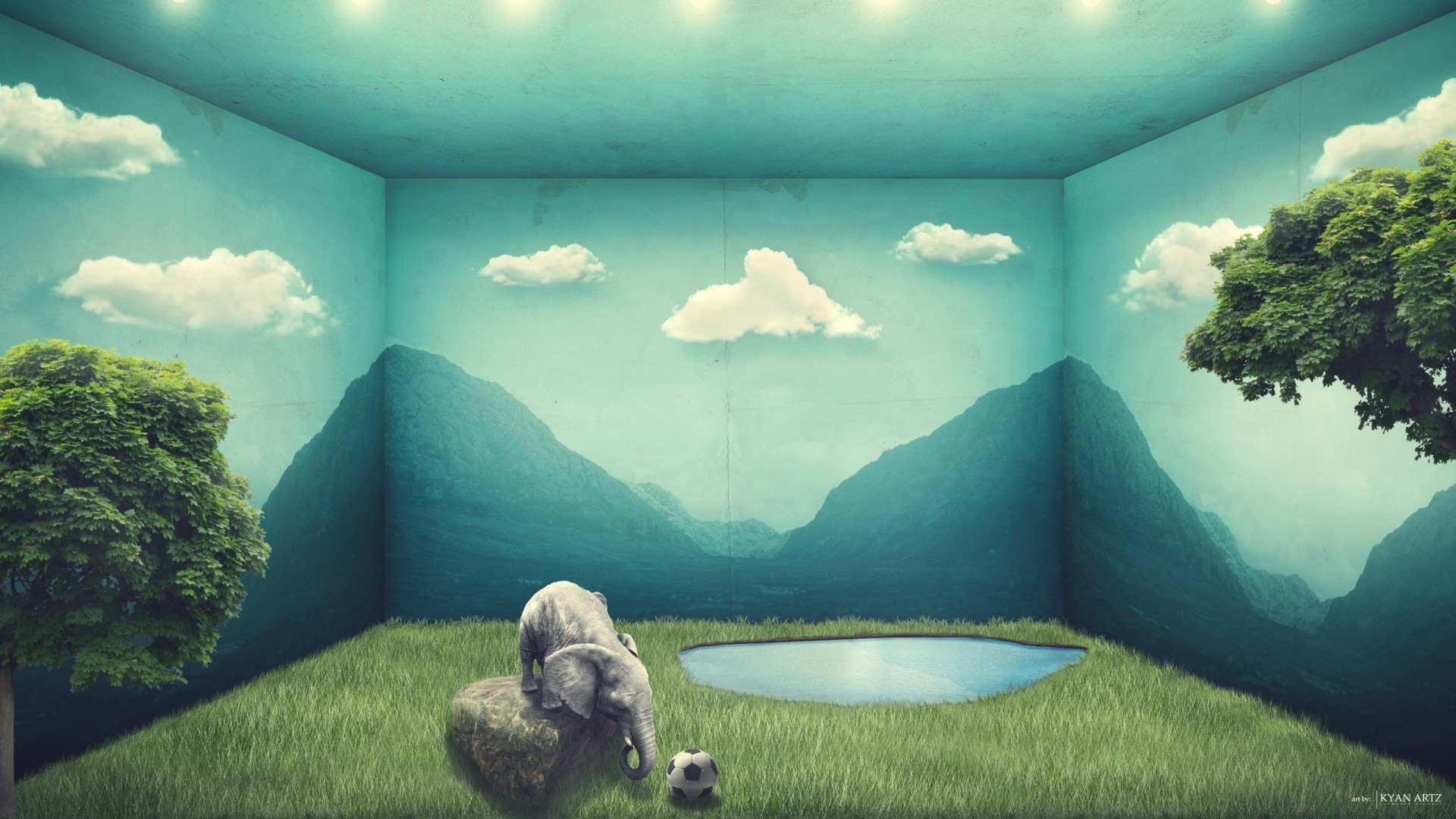 Elefant spielt Ball neben einer Pfütze