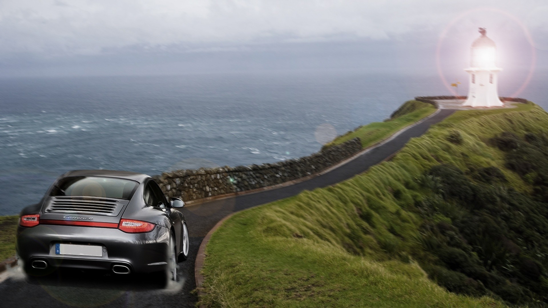 Auto fährt auf dem Weg zum Leuchtturm