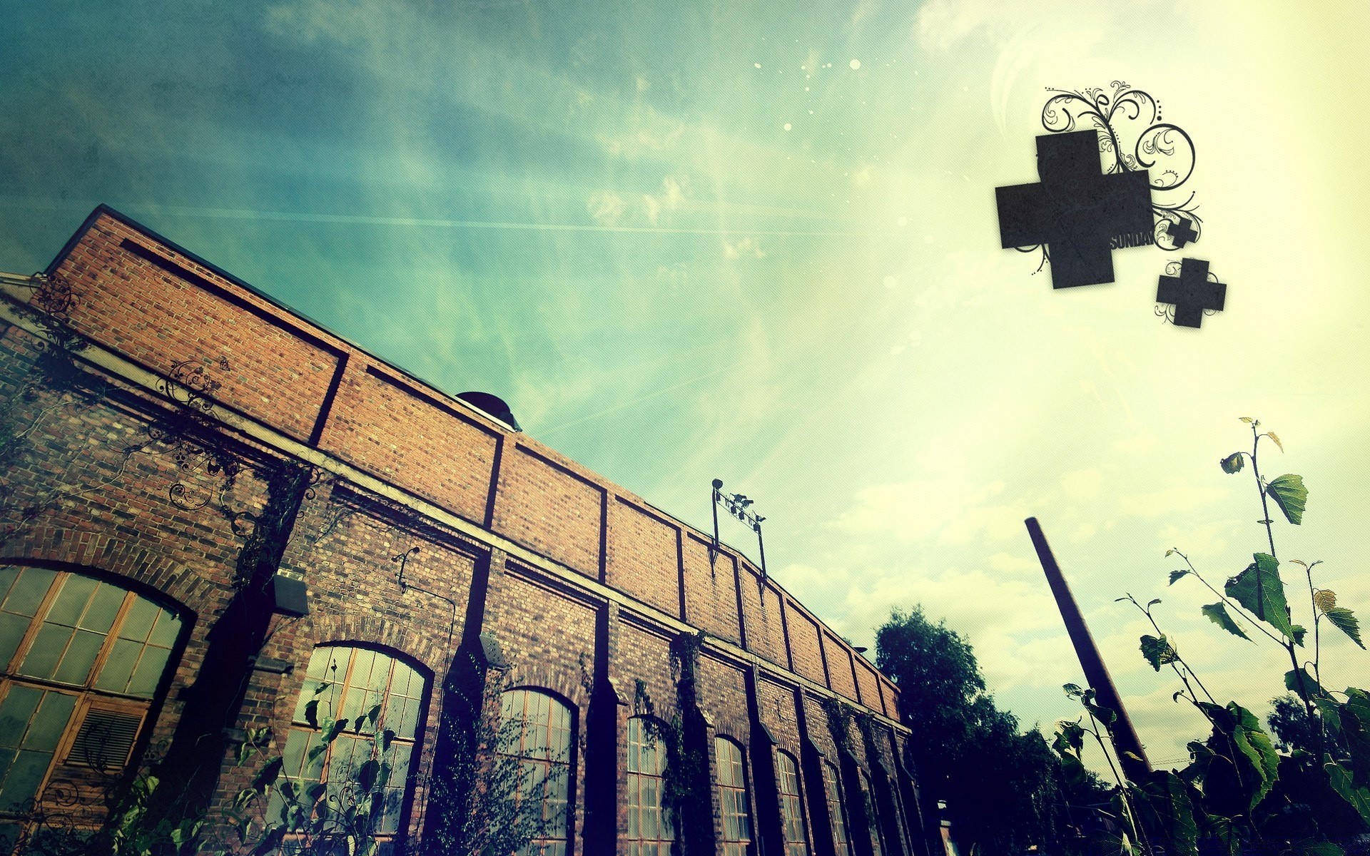Krematorium. altes gebäude aus rotem backstein. kreuze am himmelKrematorium. Altes Gebäude aus rotem Backstein. Kreuze am Himmel