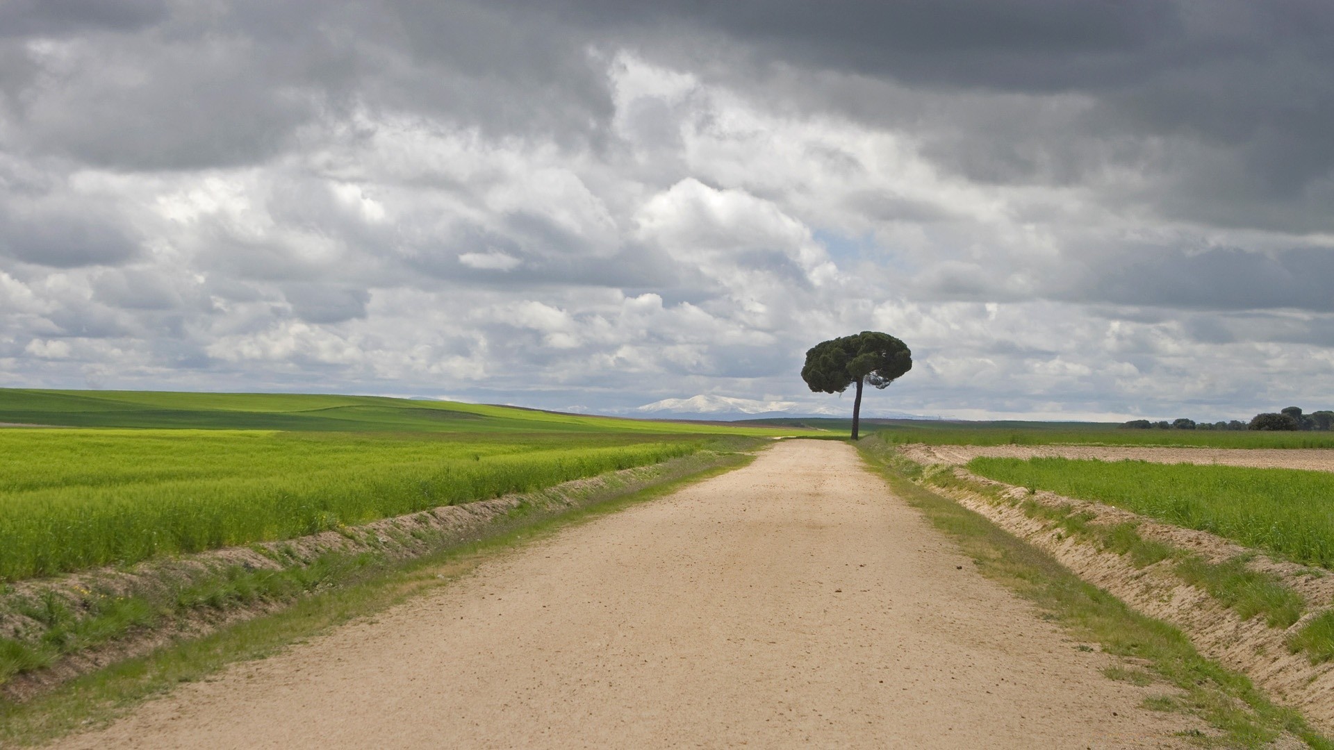Düsterer Himmel über der Straße in einem Feld mit einem einsamen Baum
