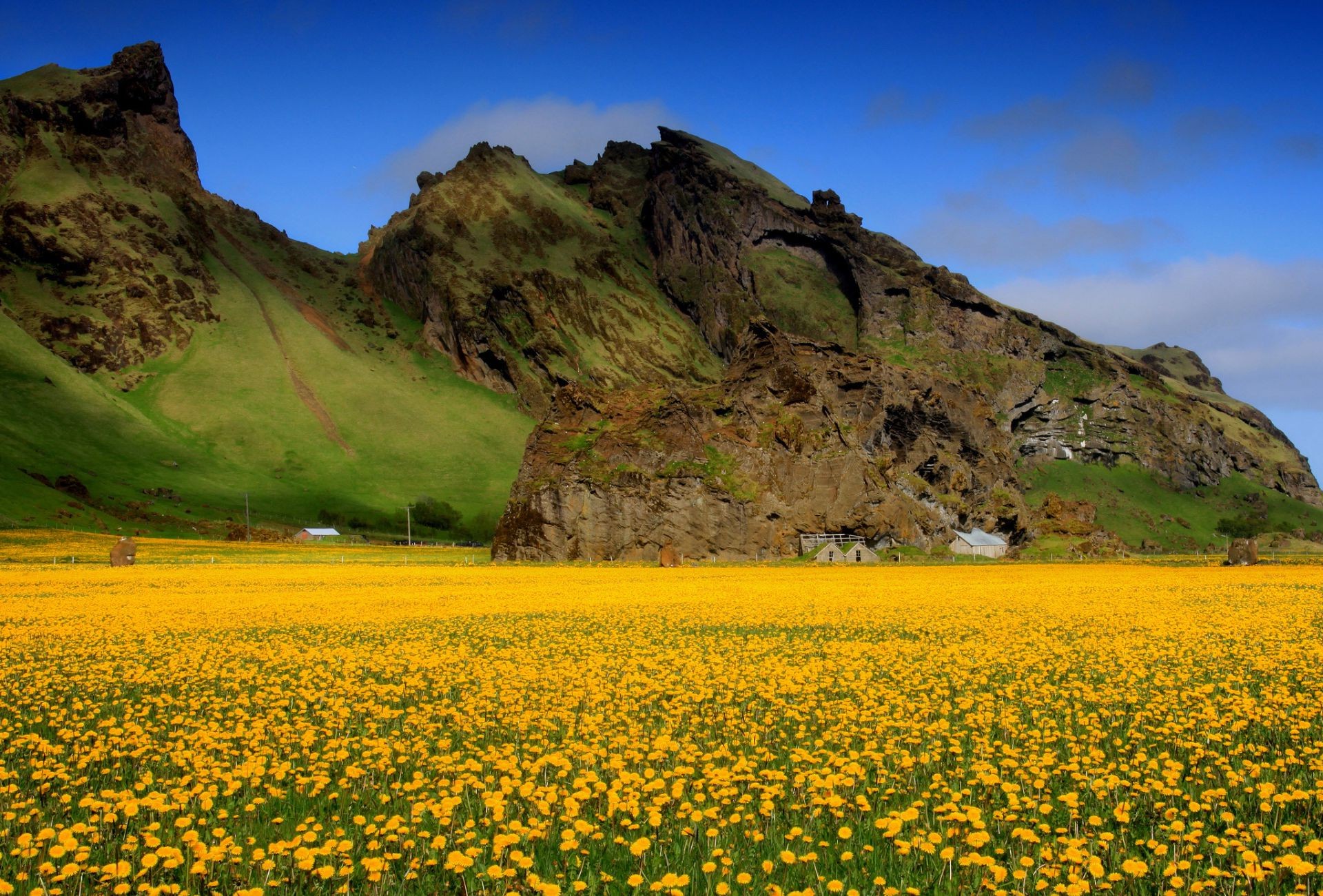 Feld mit gelben blumen auf dem hintergrund der grünen bergeFeld mit gelben Blumen auf dem Hintergrund der grünen Berge