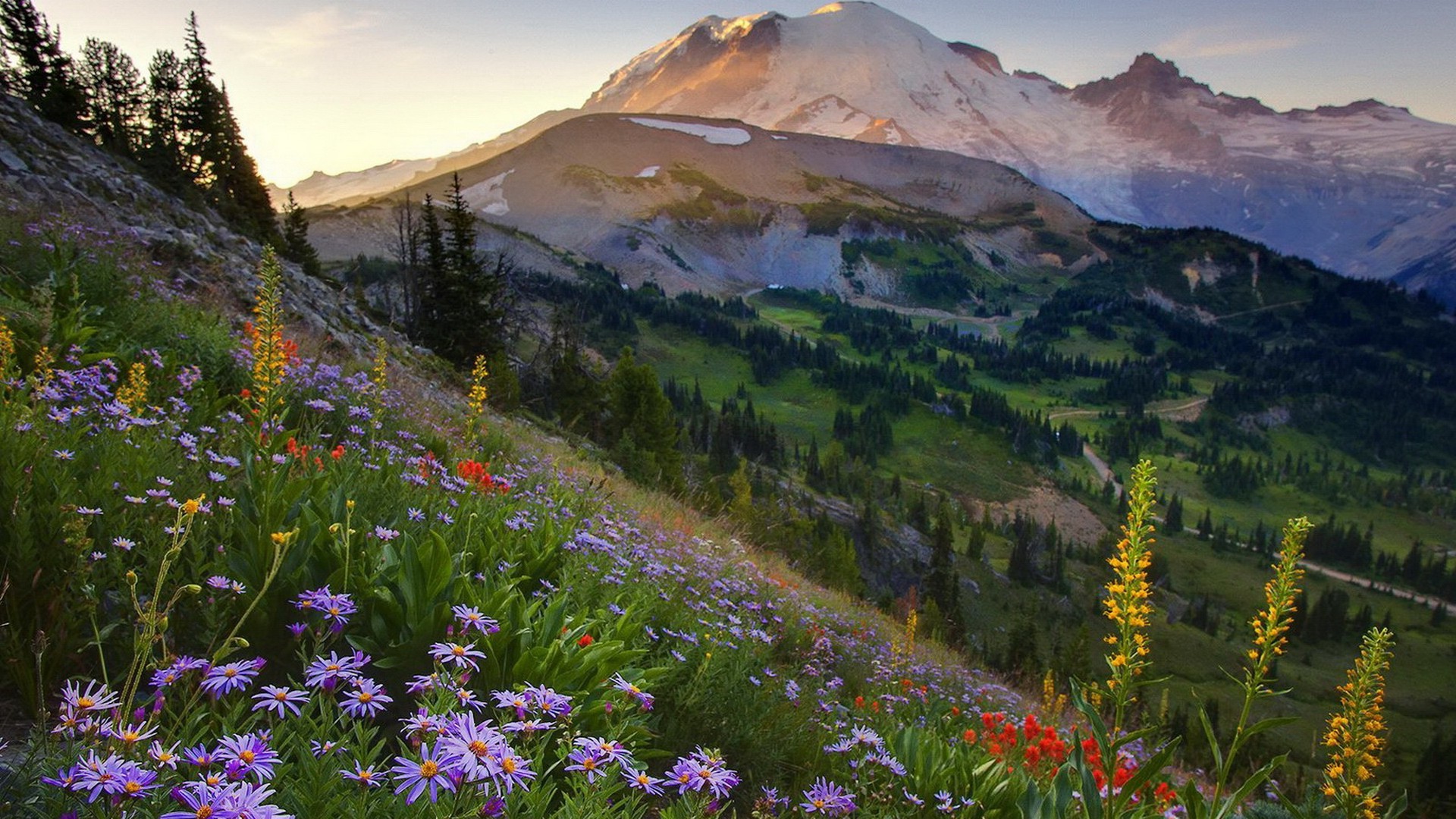 Sonnenuntergang auf einer blumenwiese in den bergenSonnenuntergang auf einer Blumenwiese in den Bergen