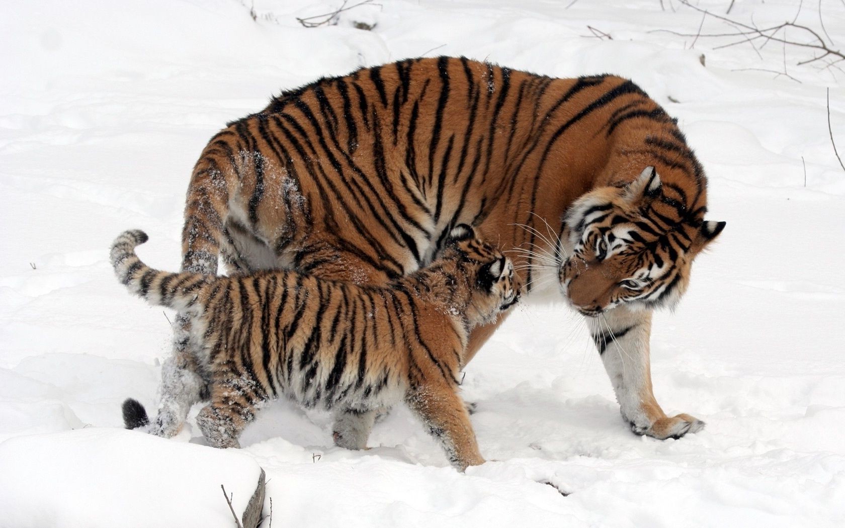 Eine Tigerin mit einem Tiger geht durch den Schnee
