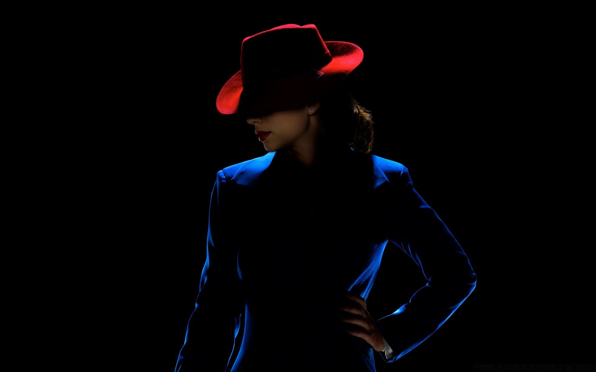 Schlankes mädchen im blauen anzug und mit rotem hutSchlankes Mädchen im blauen Anzug und mit rotem Hut
