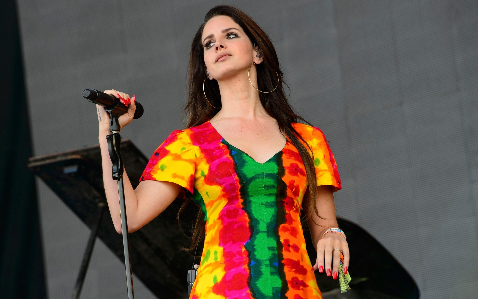 Dunkelhaarige sängerin im hellen kleid auf der bühne mit mikrofon in der hand
