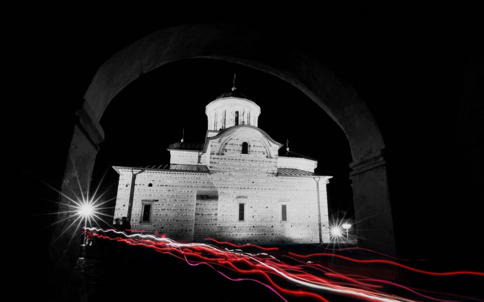 Rotes Licht beleuchtet das Haus nachts