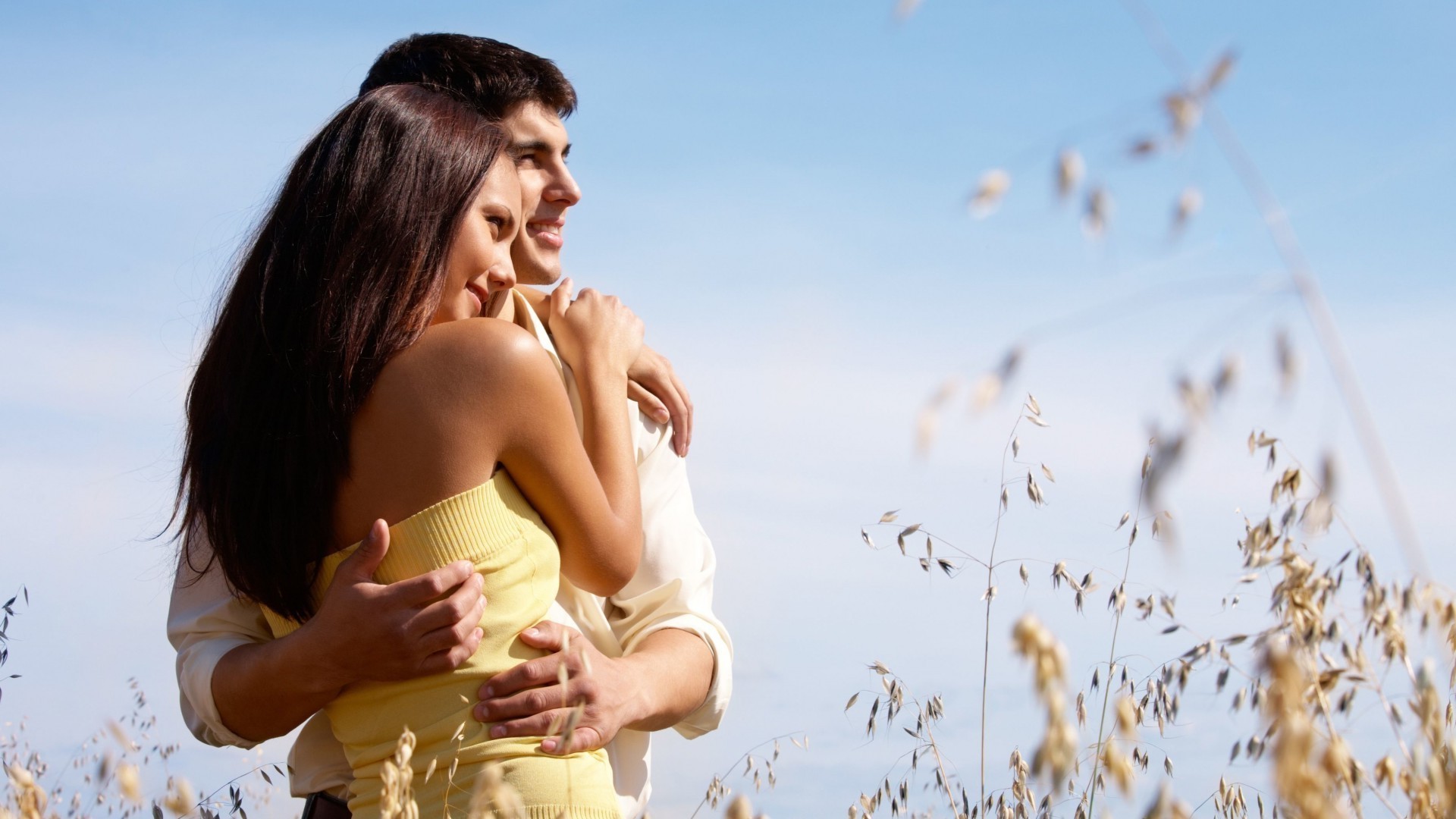 Ein Liebespaar geht auf einem mit Getreide gesäten Feld spazieren
