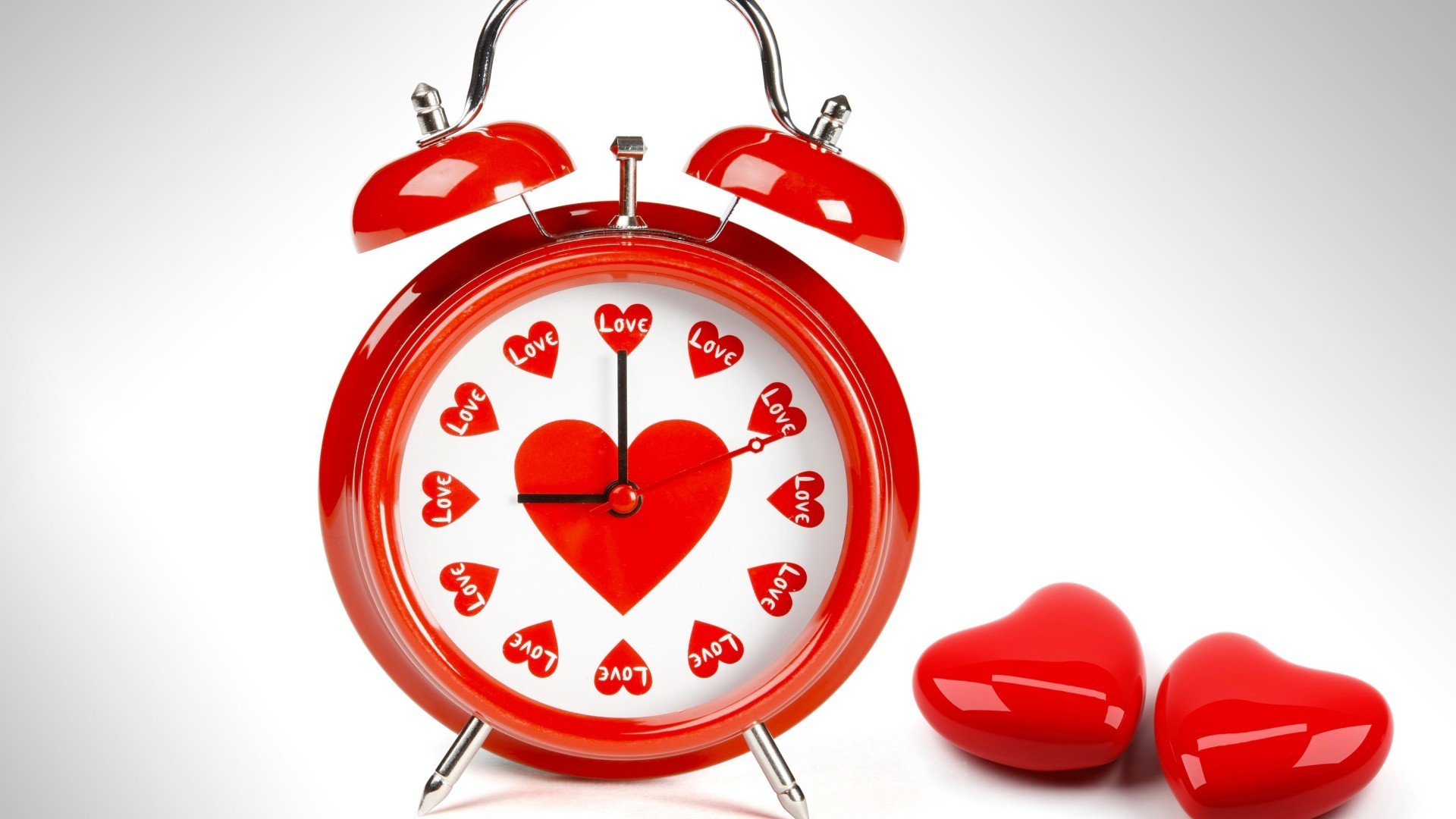 Roter Wecker mit Herzen auf dem Zifferblatt