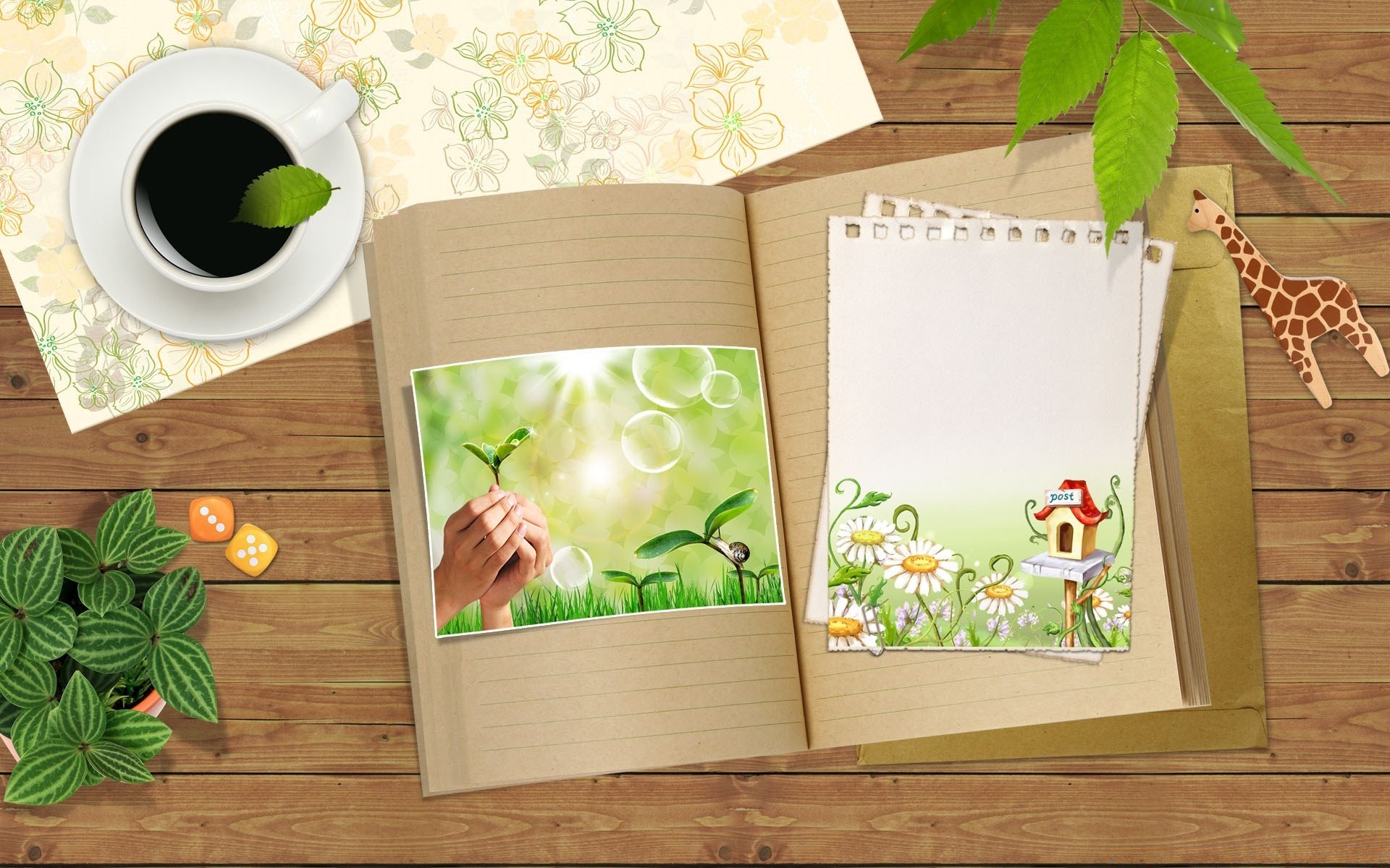 Auf einem Holztisch liegen ein Notizbuch und Kaffee