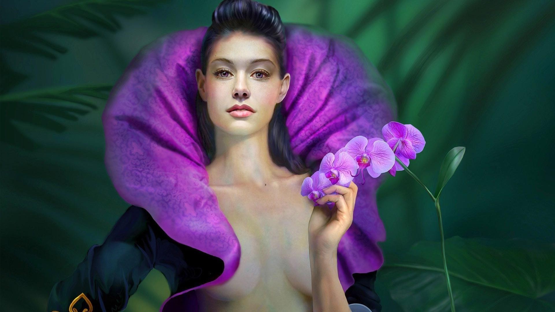 Abbildung eines Mädchens in einem lila Mantel mit Orchideen