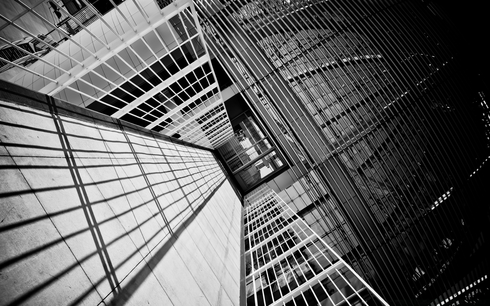 Schwarz-Weiß-Foto des Gebäudes am Himmelshintergrund