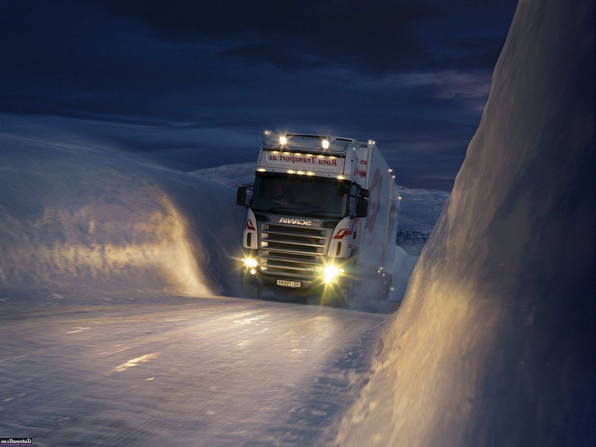 Ein Lastwagen, der auf einer schneebedeckten nächtlichen Wintertrasse bergauf fährt