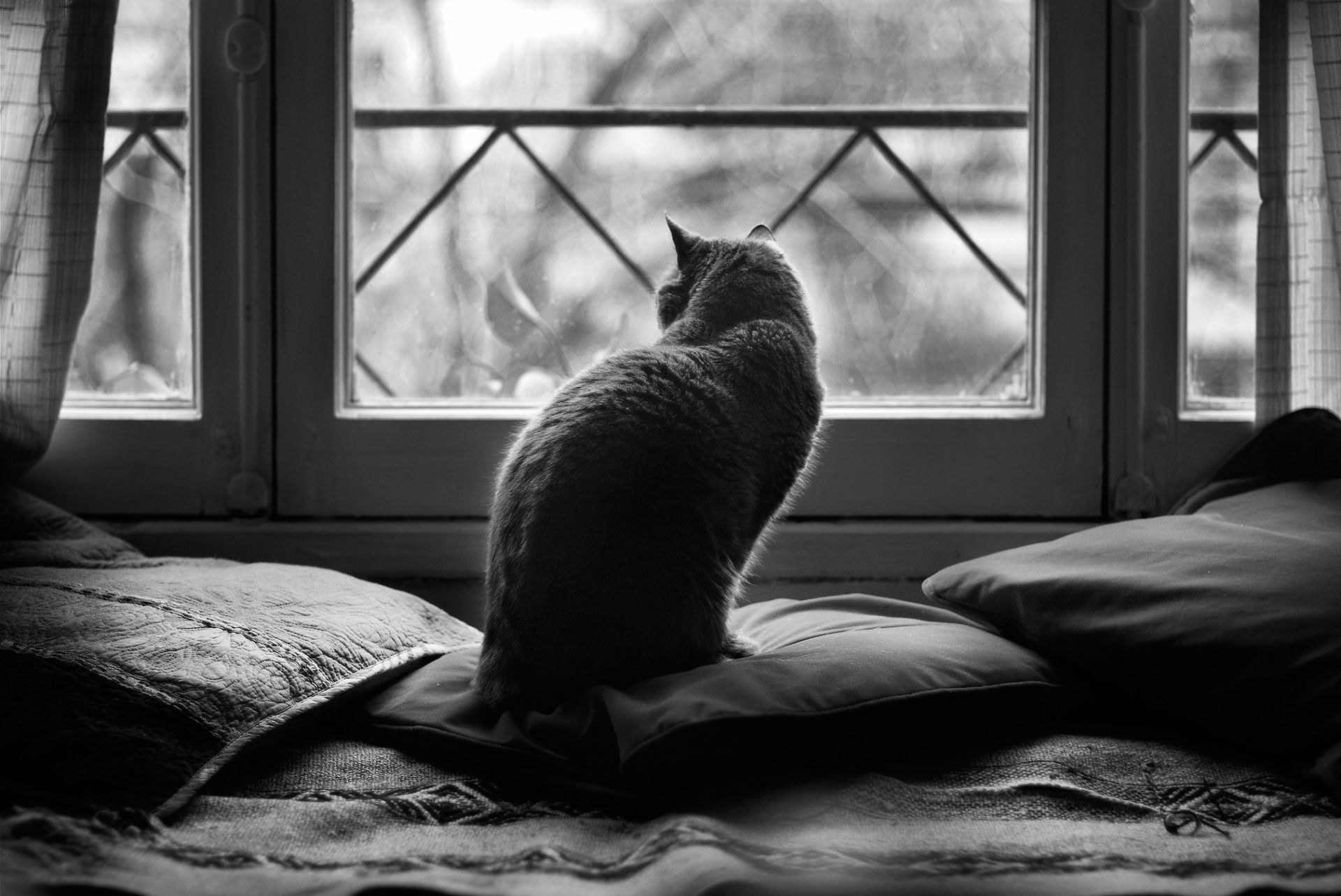 Flauschige Katze auf dem Hintergrund des schneebedeckten Landes