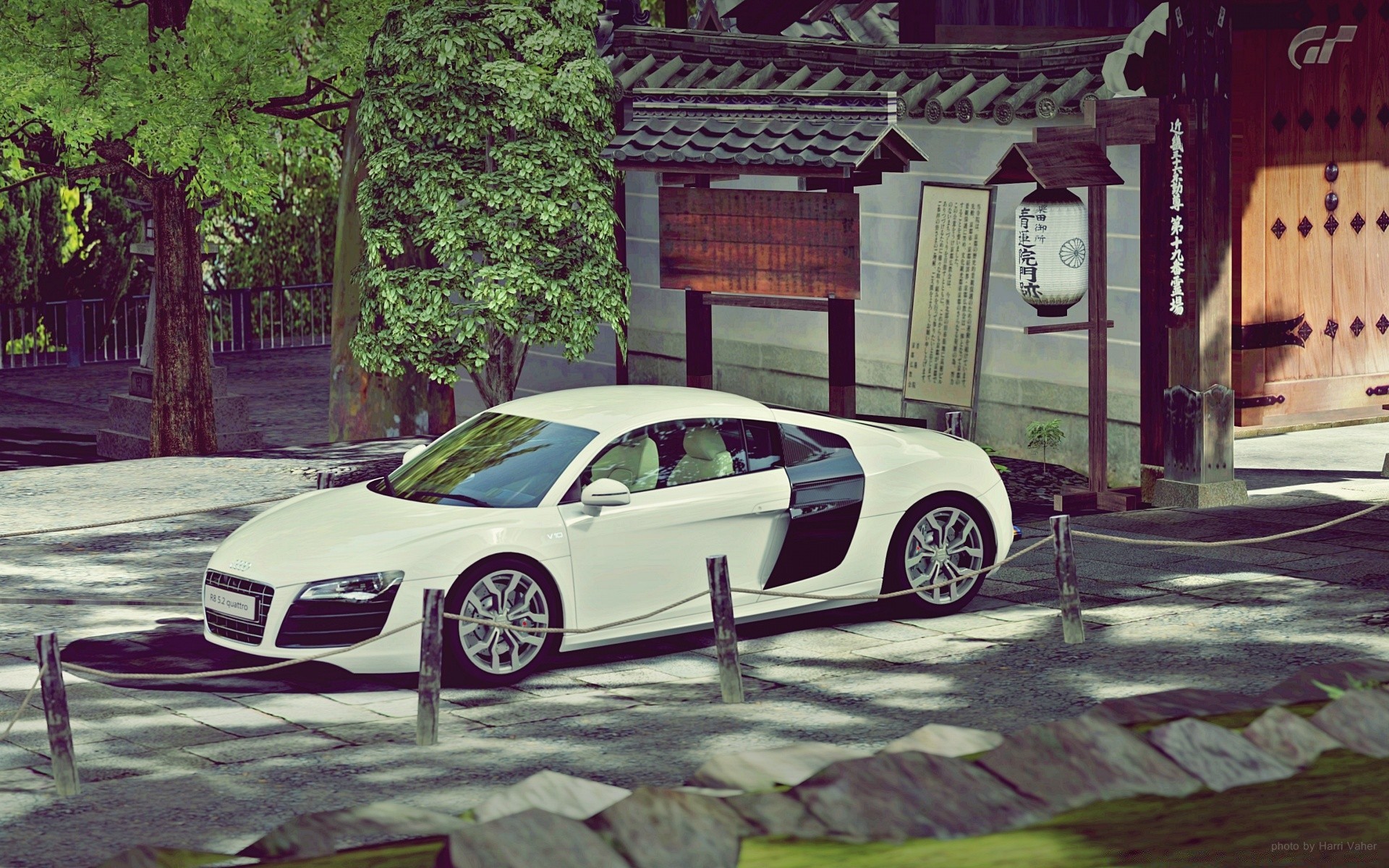 Blaues auto in der stadt im computerspiel gran turismoBlaues Auto in der Stadt im Computerspiel gran turismo