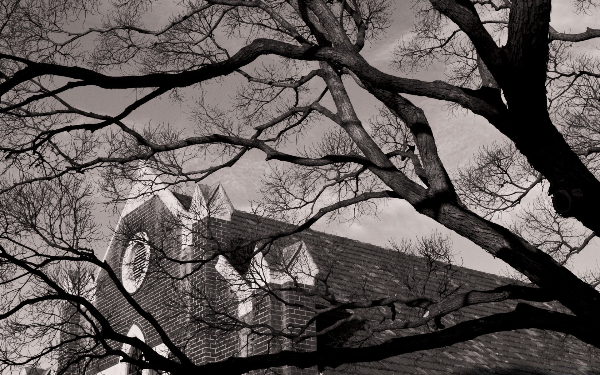 Ein Schloss hinter einem Baum in grauem Maßstab