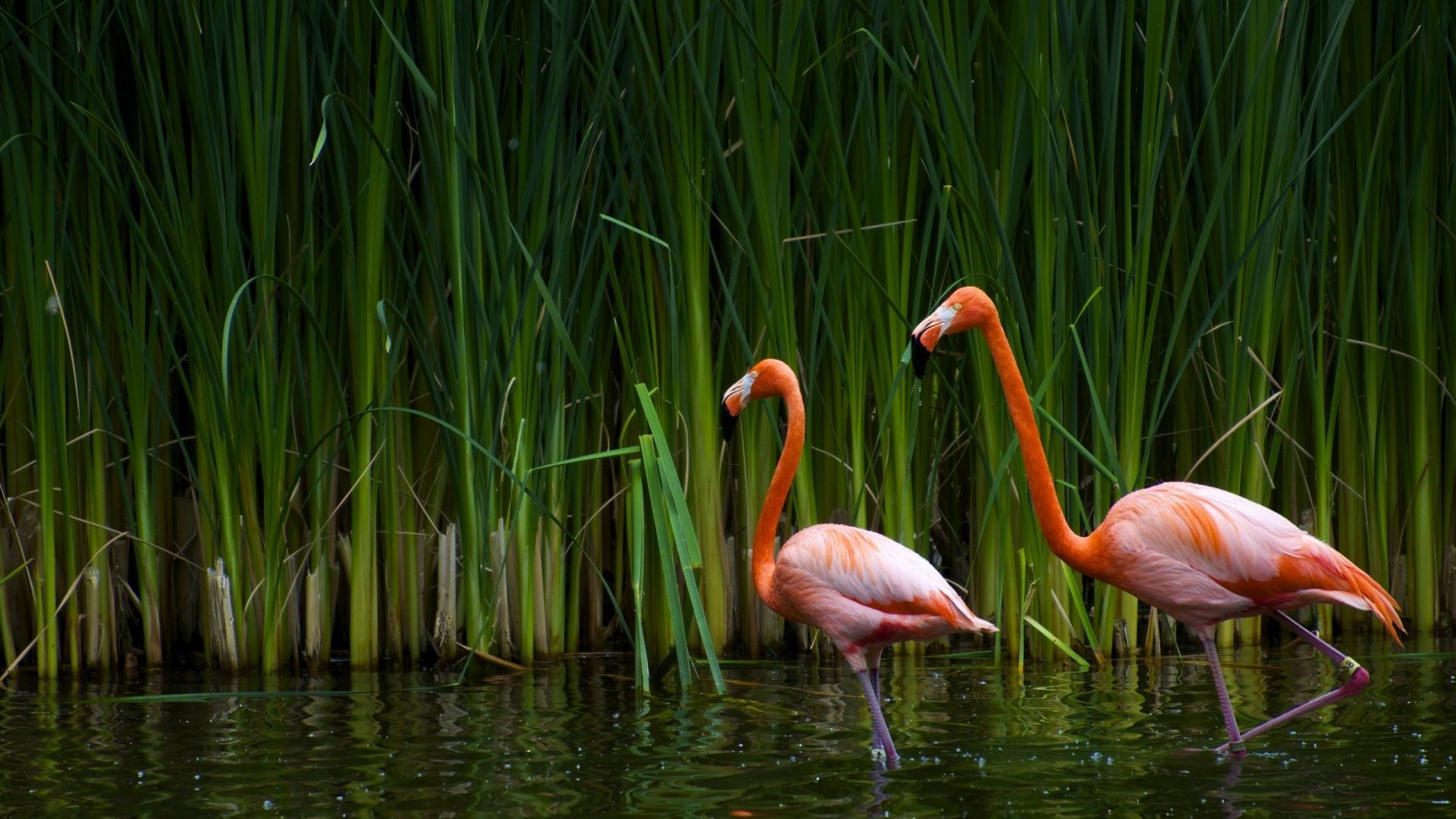 Rote Flamingos schleichen sich im Schilf