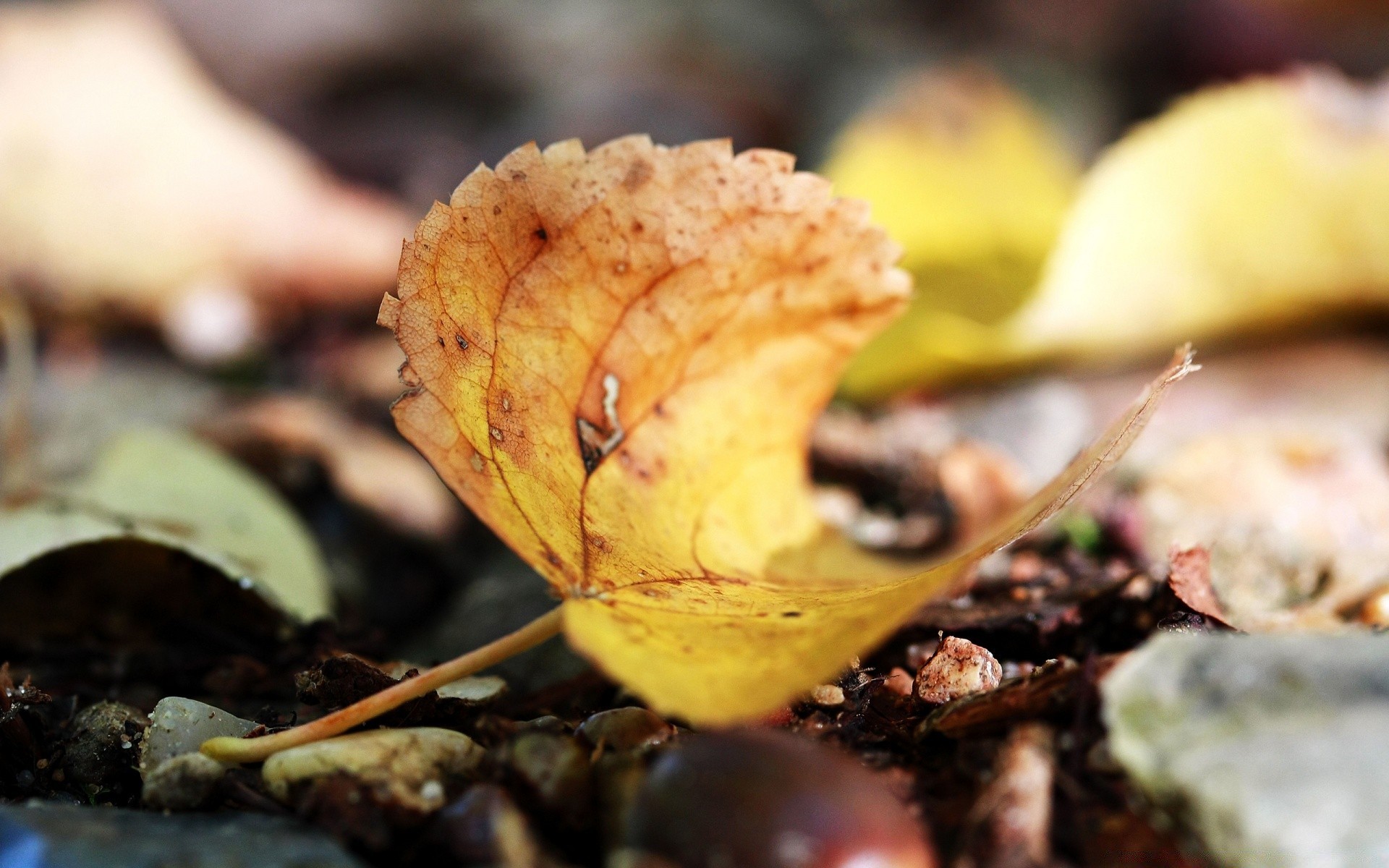 Nahaufnahme eines gelben Blattes auf dem Boden