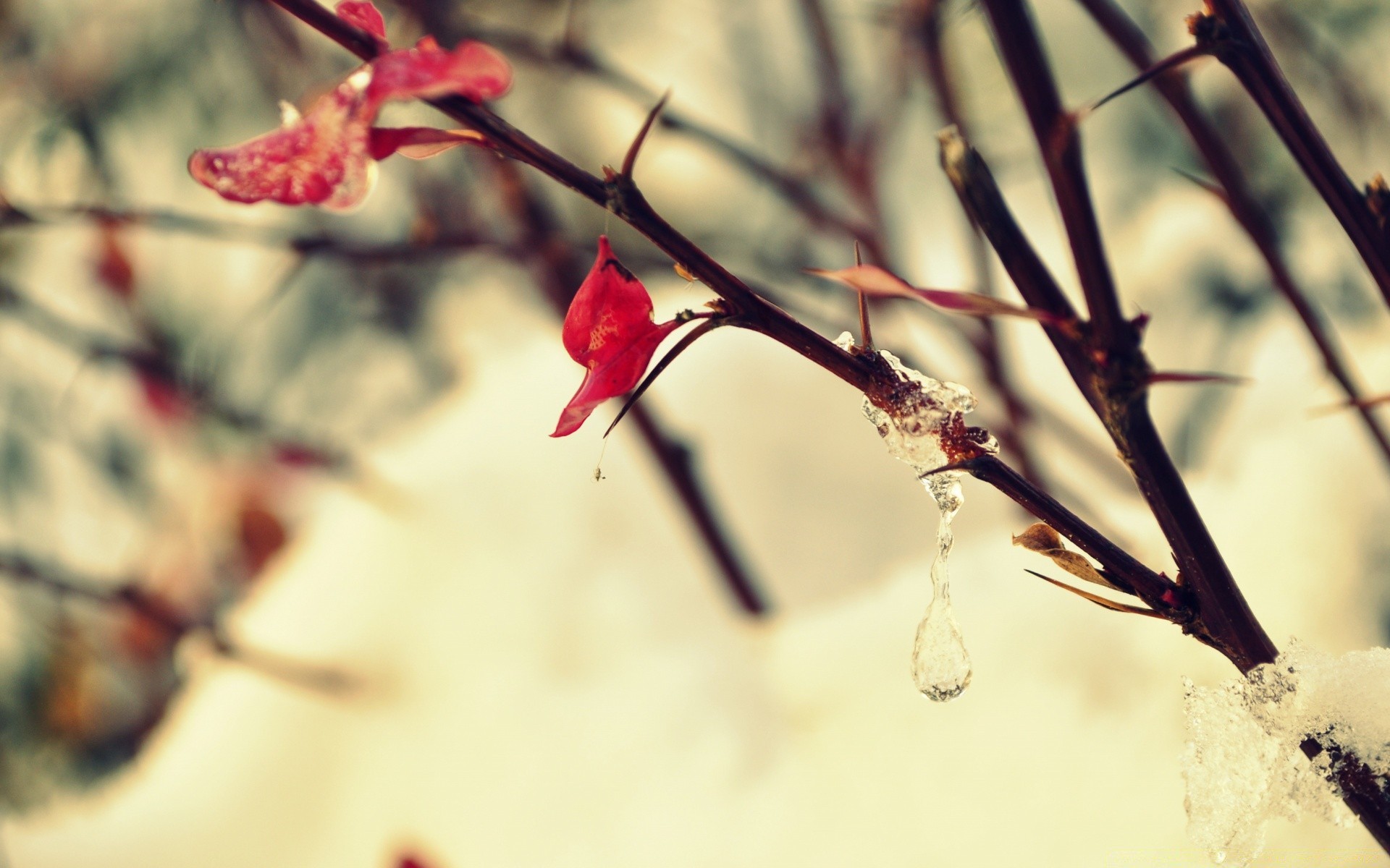 Zweige von pflanzen mit blättern im winter im schneeZweige von Pflanzen mit Blättern im Winter im Schnee