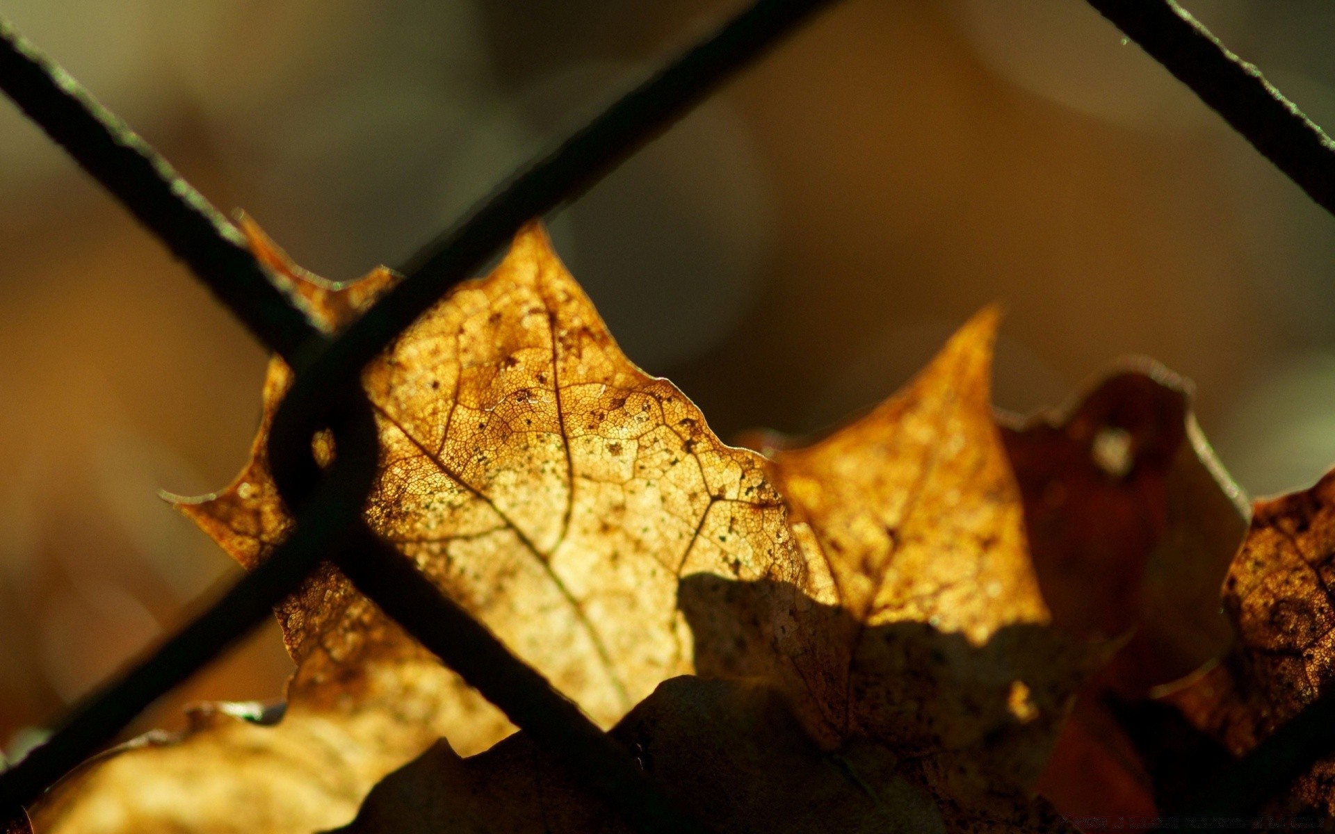 Hinter dem Gitter ist ein durch Sonnenlicht beleuchtetes trockenes Ahornblatt
