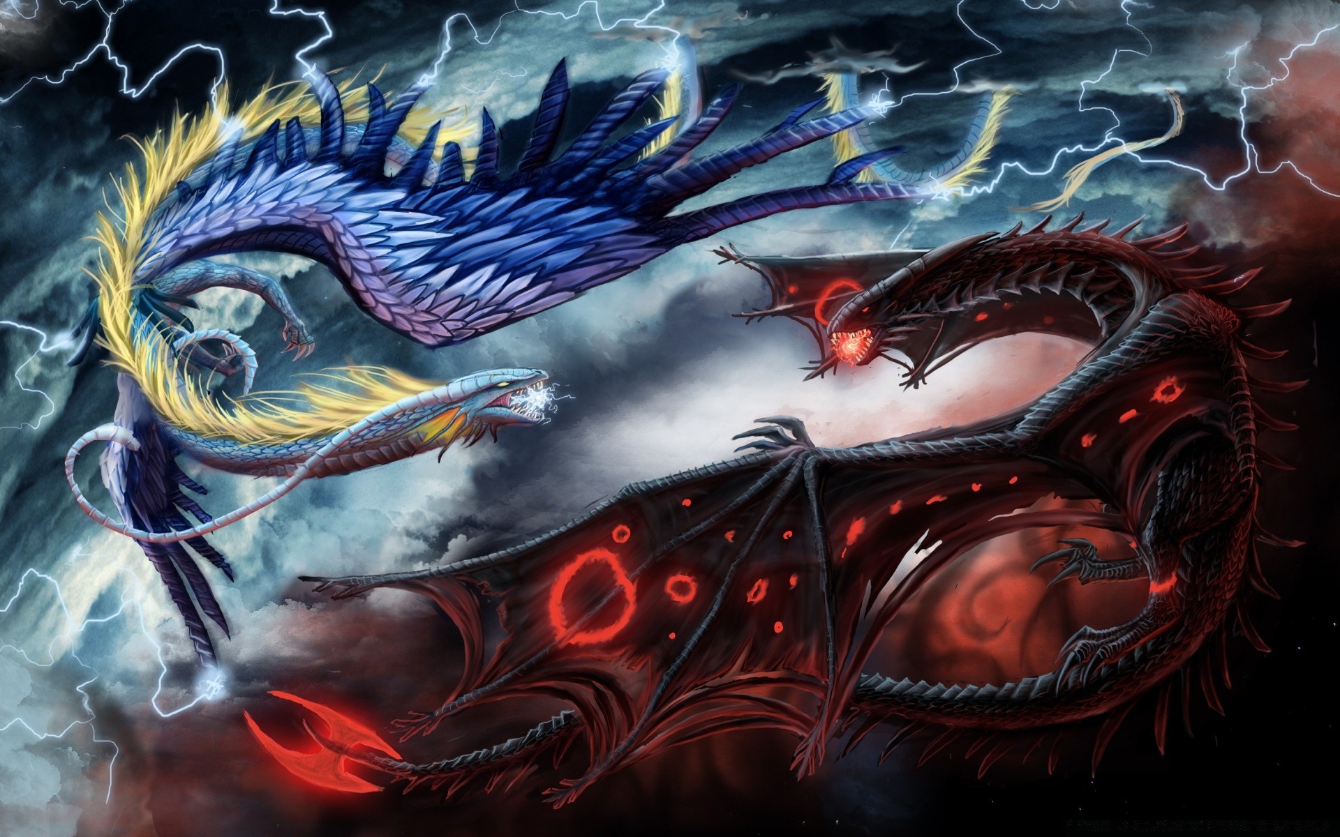 Kampf der drachen von feuer und donner. fantasy-drachen. naturgewaltenKampf der Drachen von Feuer und Donner. Fantasy-Drachen. Naturgewalten