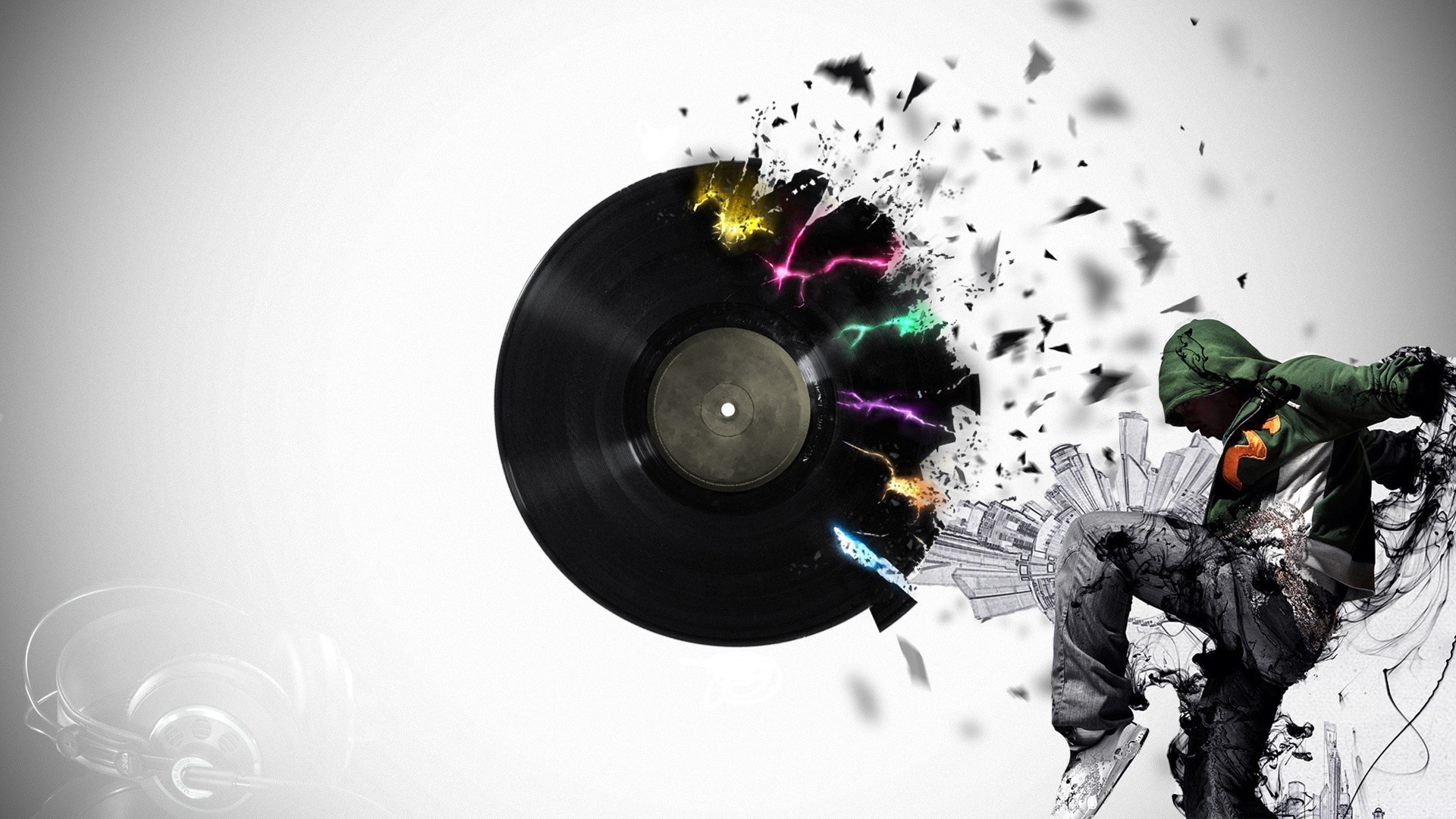 Kreativer hintergrund mit tanzendem mann und schallplatteKreativer Hintergrund mit tanzendem Mann und Schallplatte