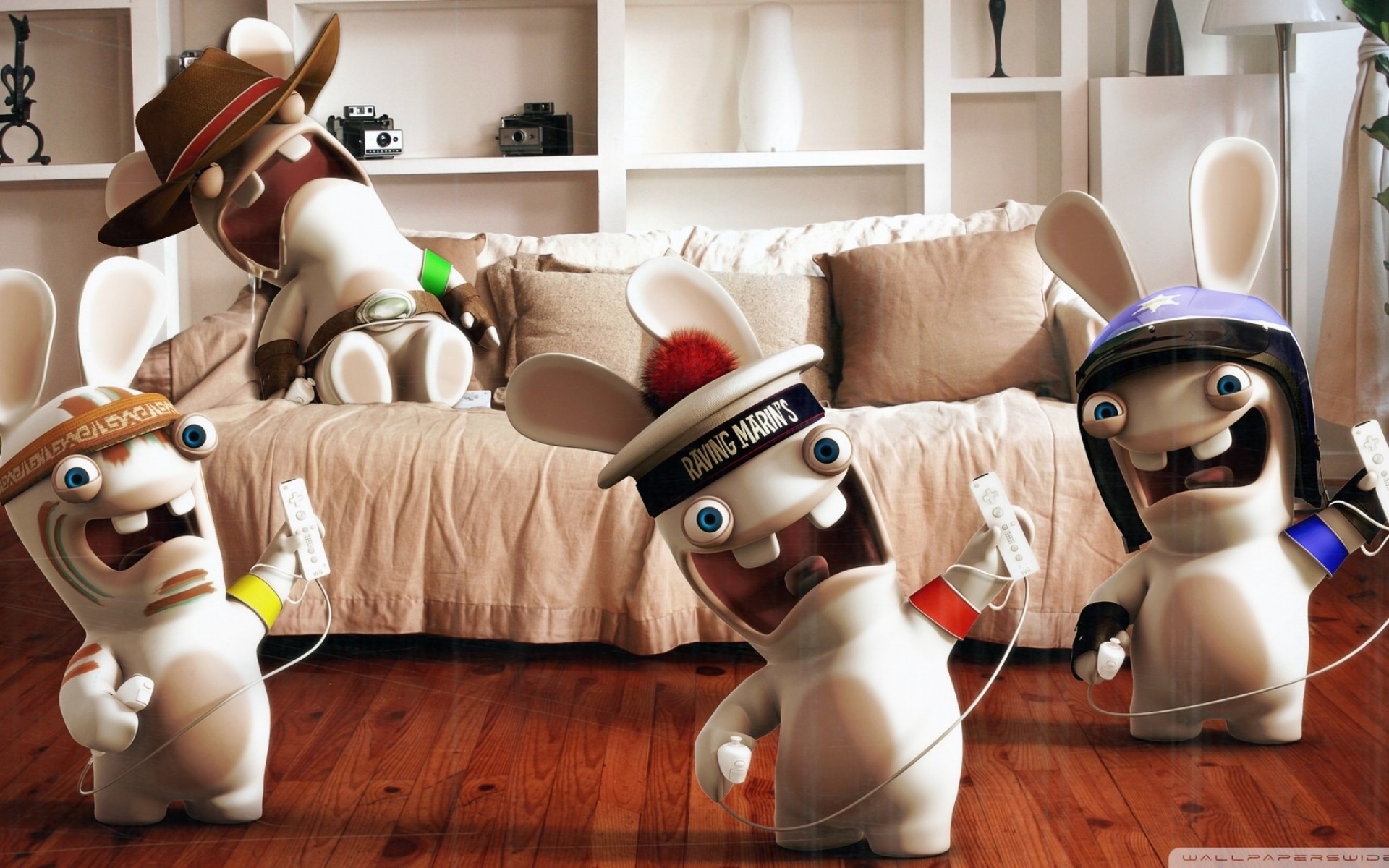 Im Raum tanzen Hasen am Sofa Abstraktion