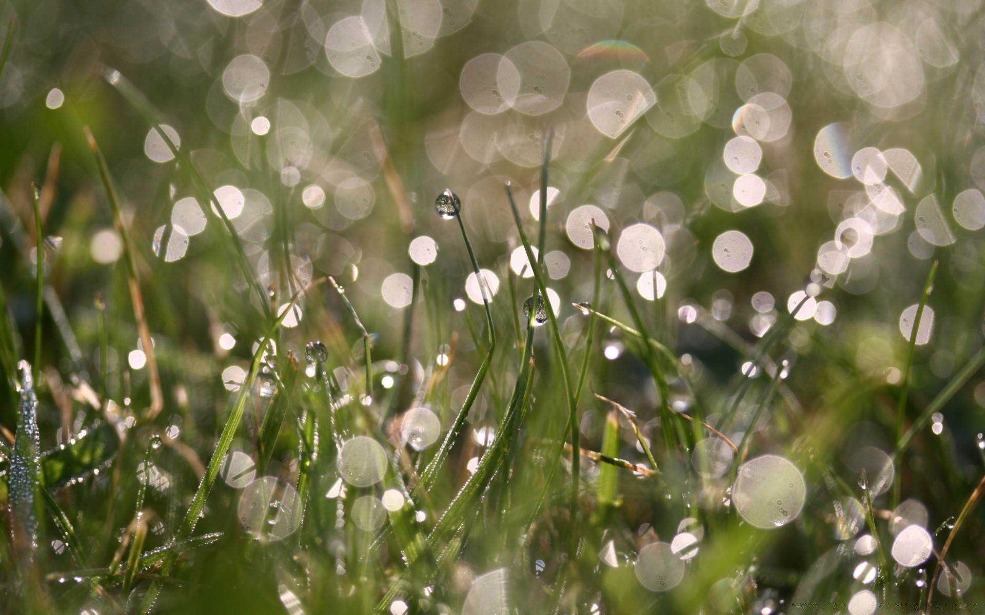 Makroaufnahmen von Regentropfen im Gras