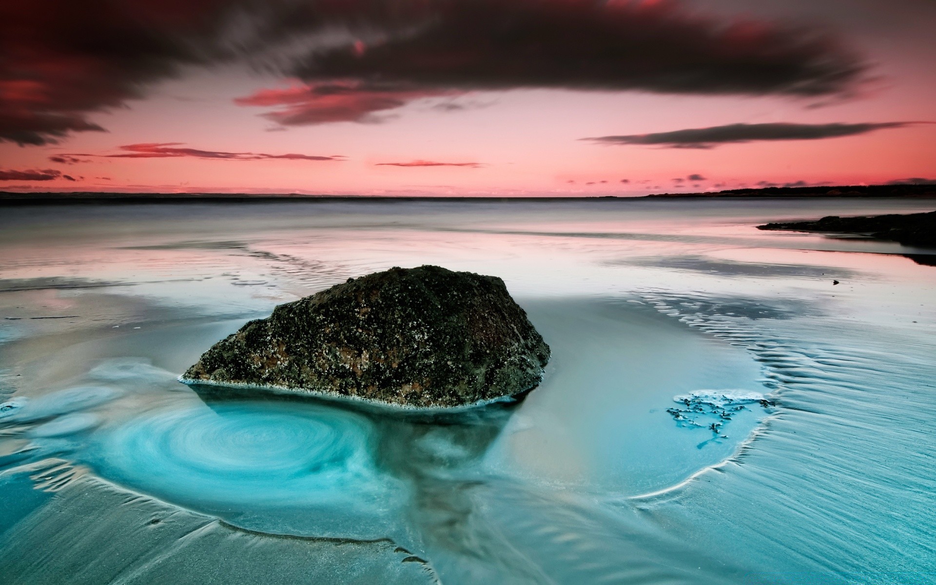 Brücke in der Ferne und Wellen auf einem rosa und blauen Himmelshintergrund