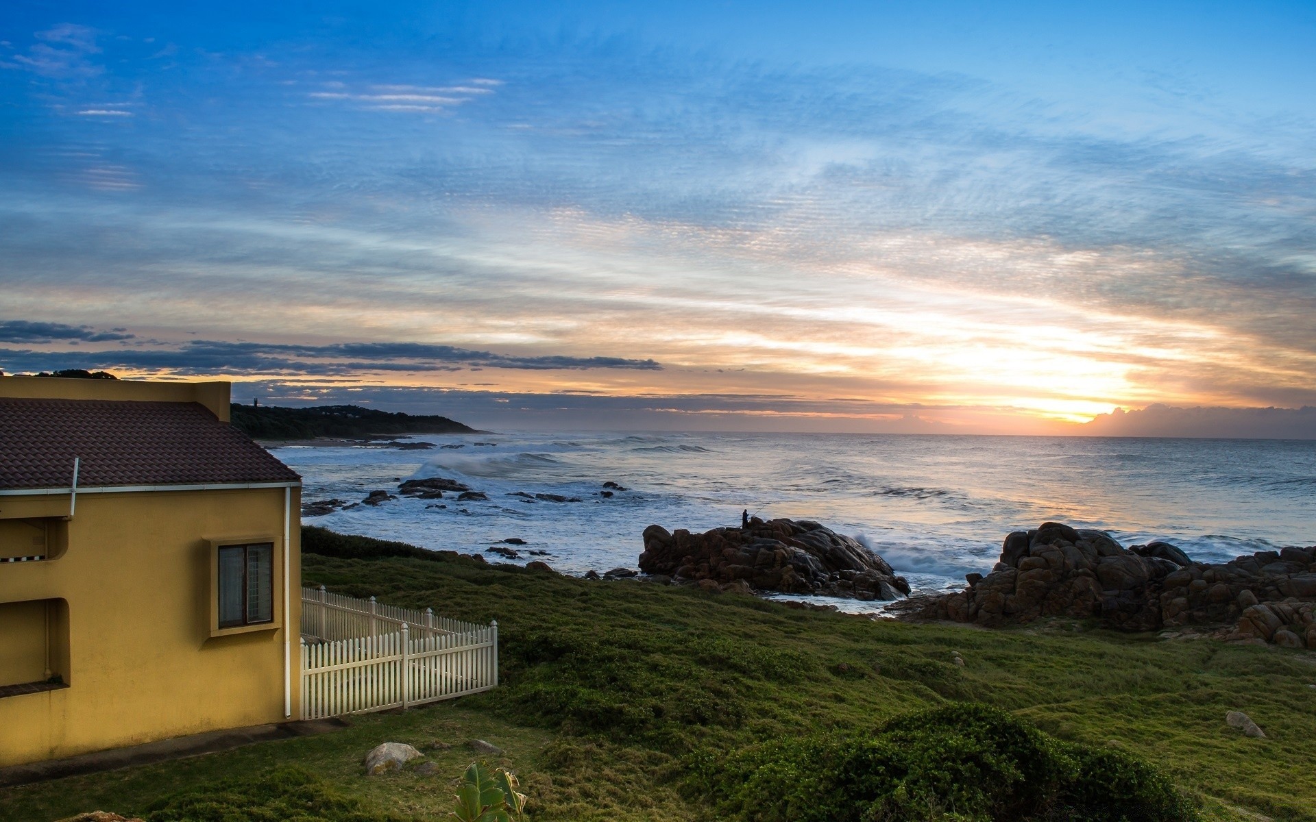 Sonnenuntergang am Meer in orangefarbenen Tönen, Pier