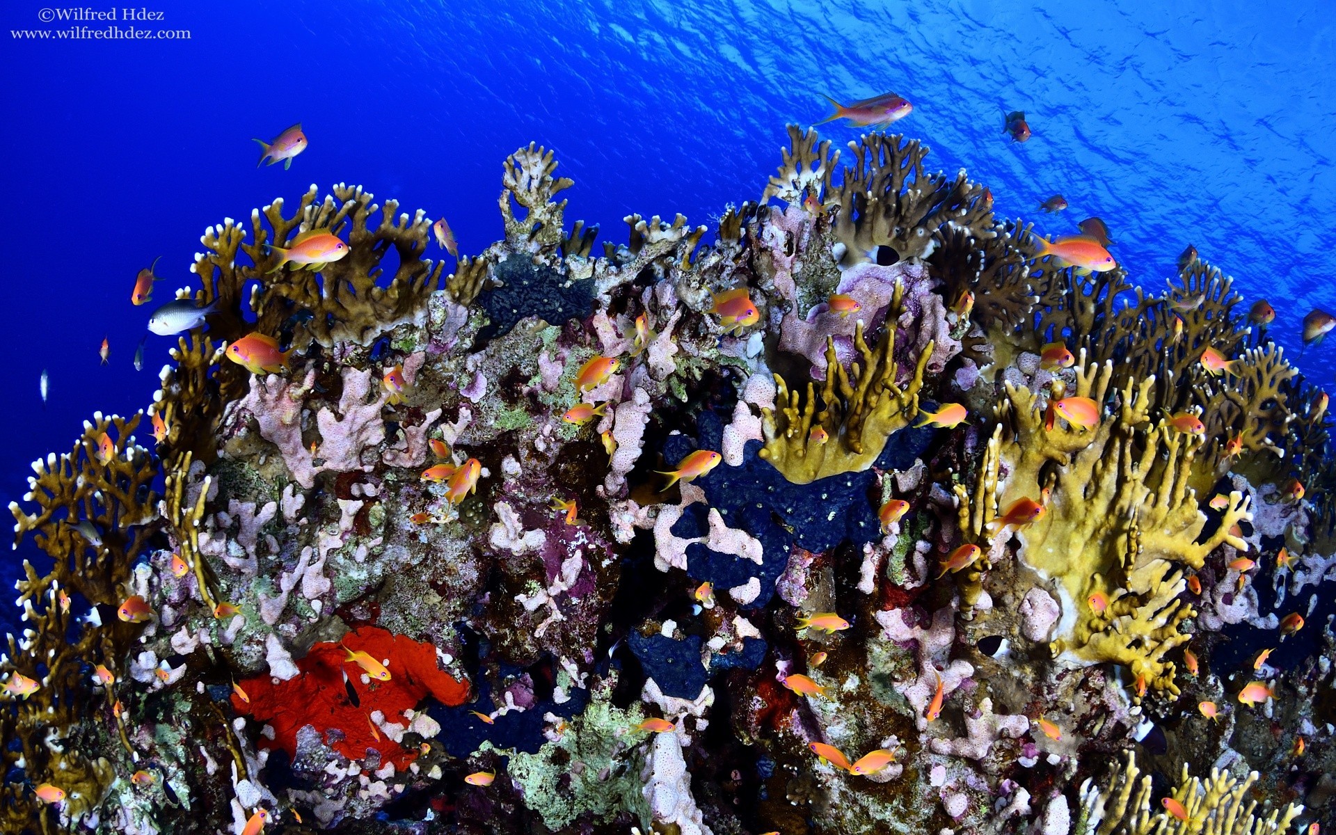 Krabbe vor dem Hintergrund von Algen unter Wasser