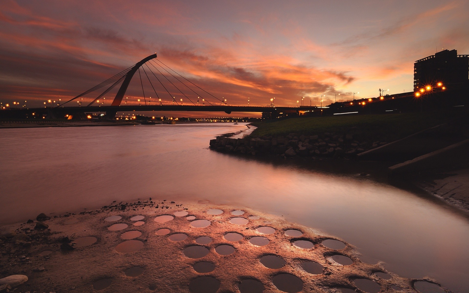 Stadt Sonnenuntergang auf See Hintergrund in der Nacht