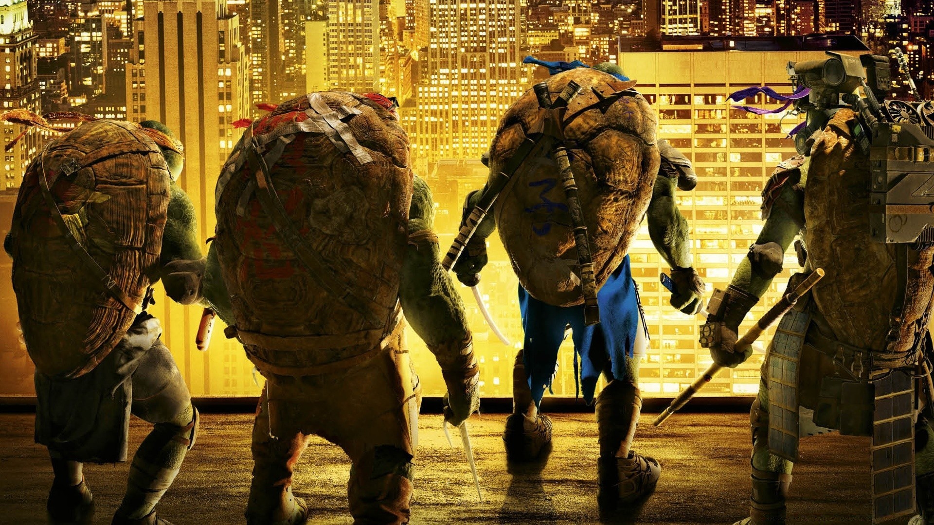 Ninja Turtles schauen auf die beleuchtete Stadt