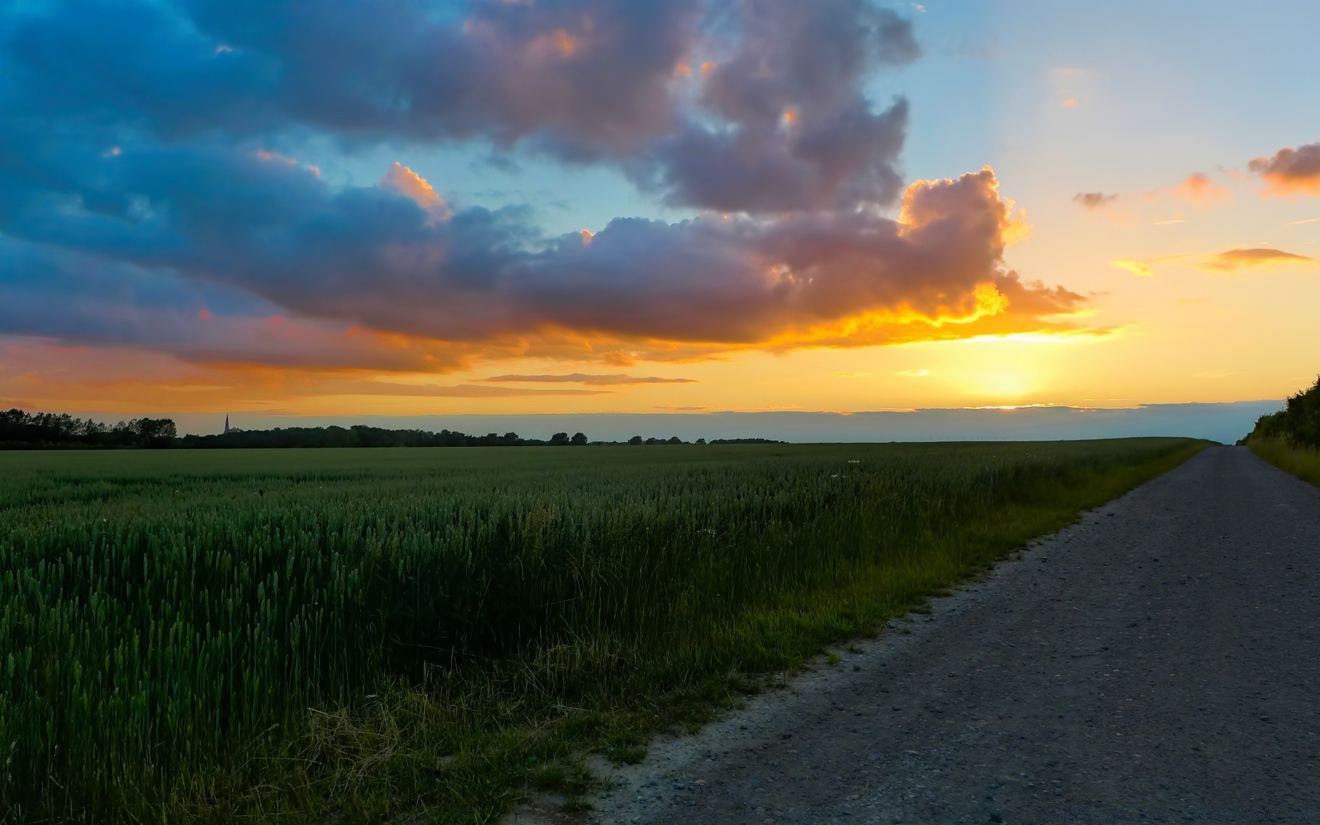 Sonnenuntergang auf einer landstraße ohne menschenSonnenuntergang auf einer Landstraße ohne Menschen