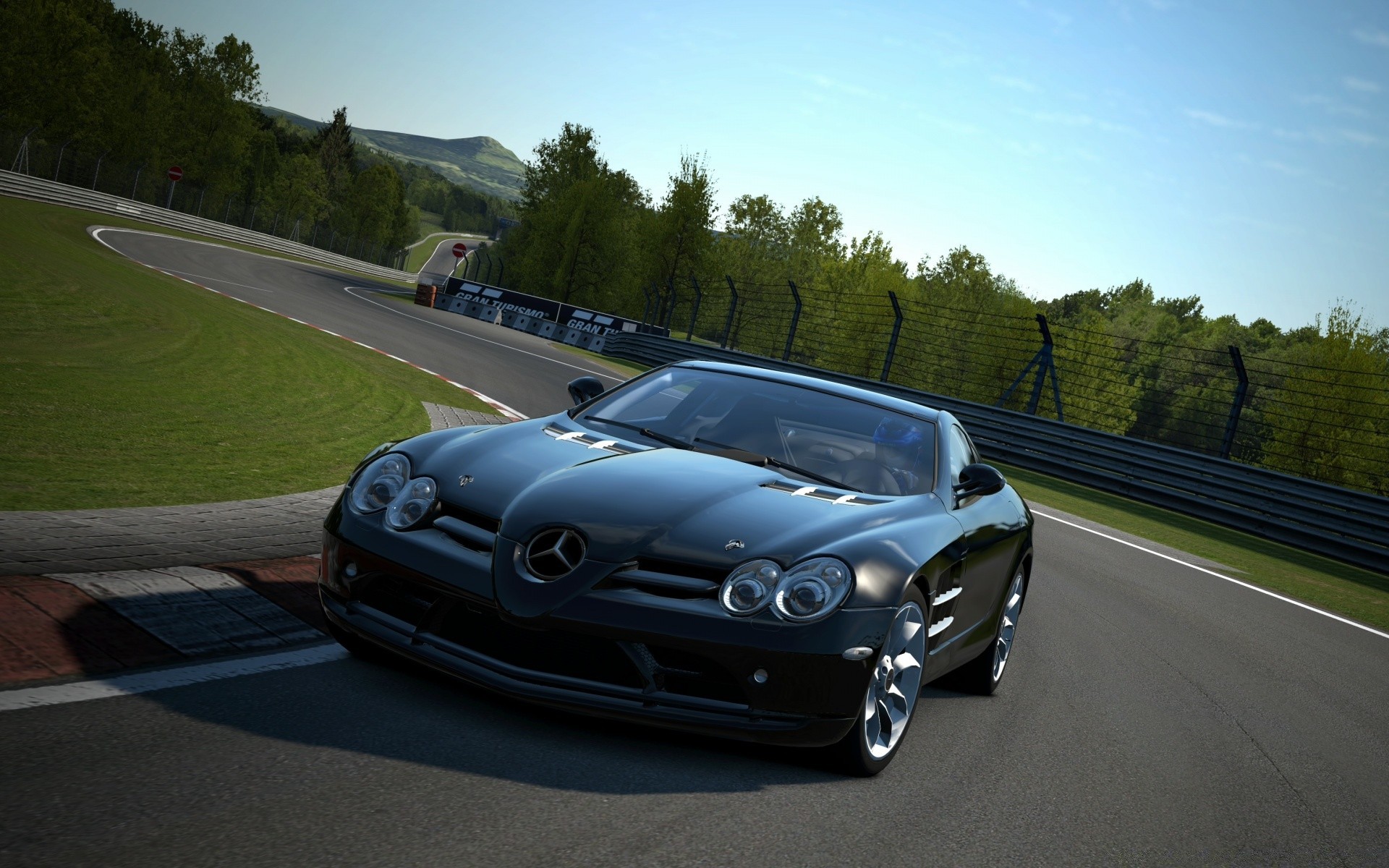Schwarzer Mercedes auf glattem Asphalt an einem sonnigen Tag