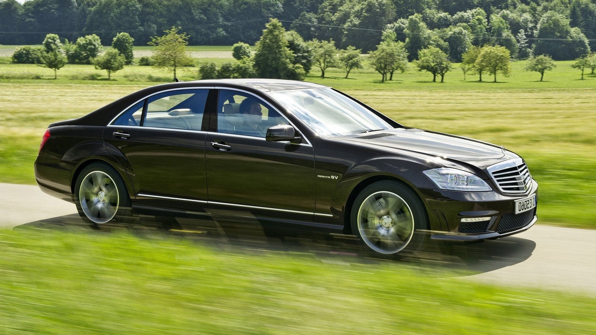 Schwarzer Mercedes fährt über ein grünes Feld