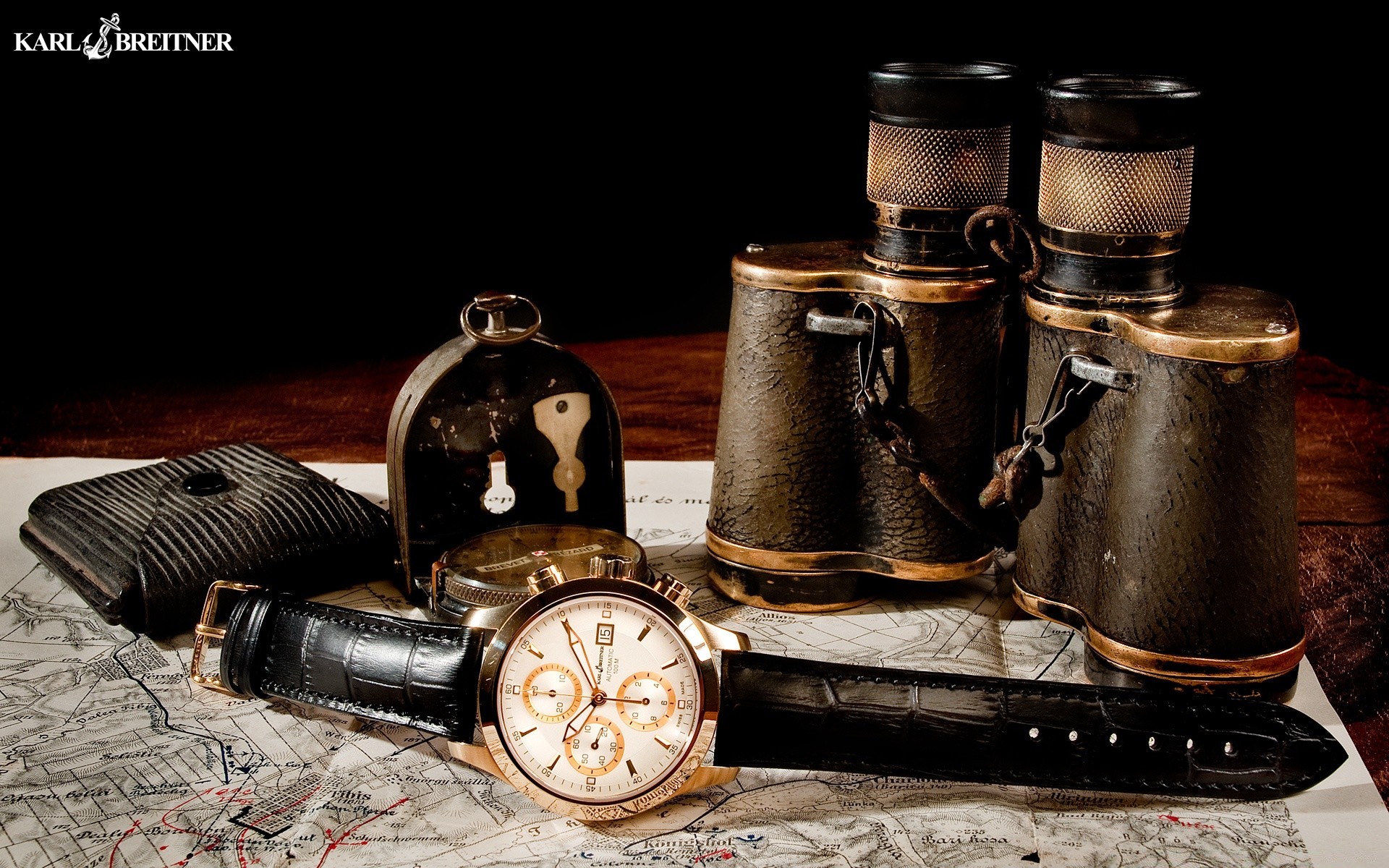 Antike Retro-Gegenstände auf einem Tisch aus Messing