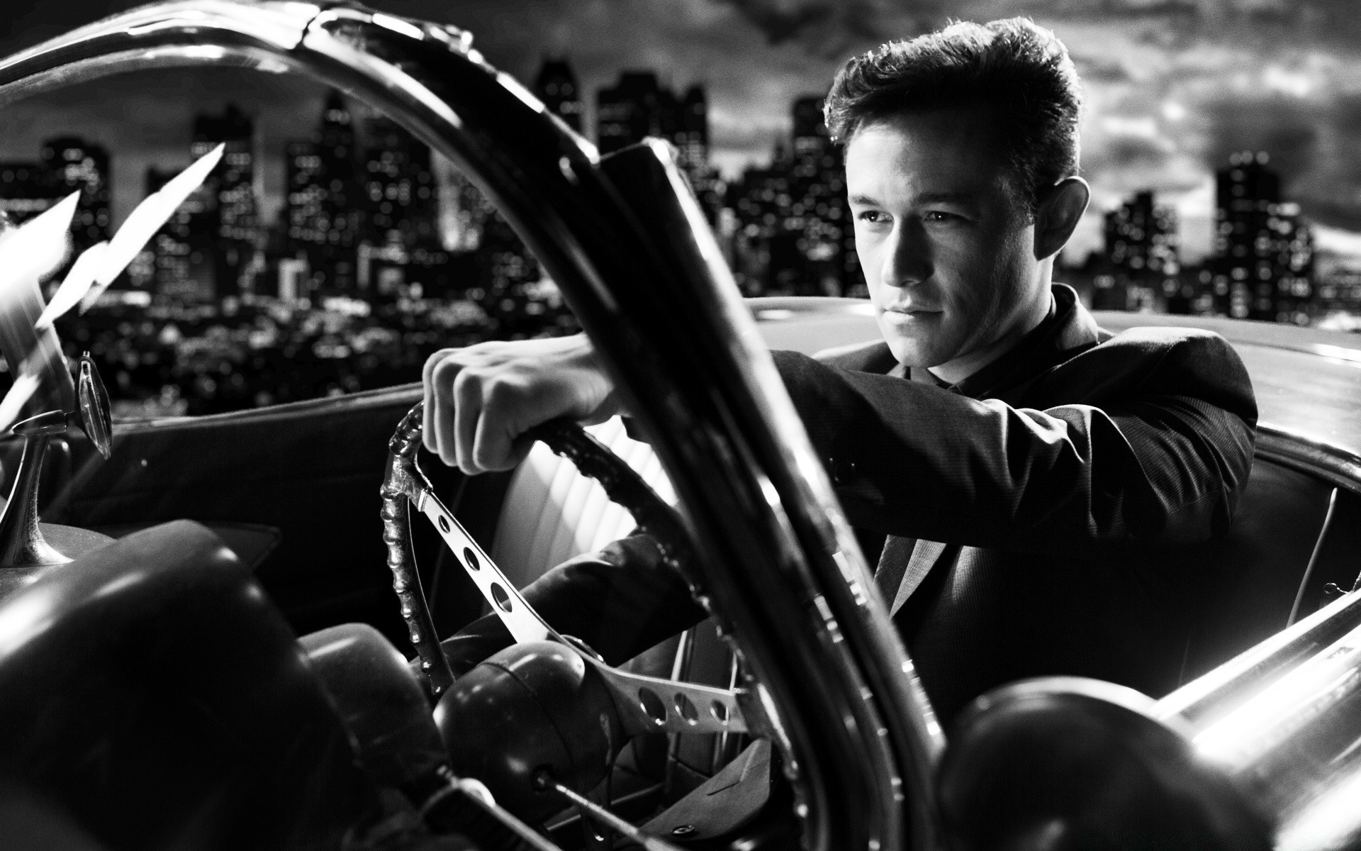 Schwarz-Weiß-Porträt eines Mannes, der ein Cabrio fährt