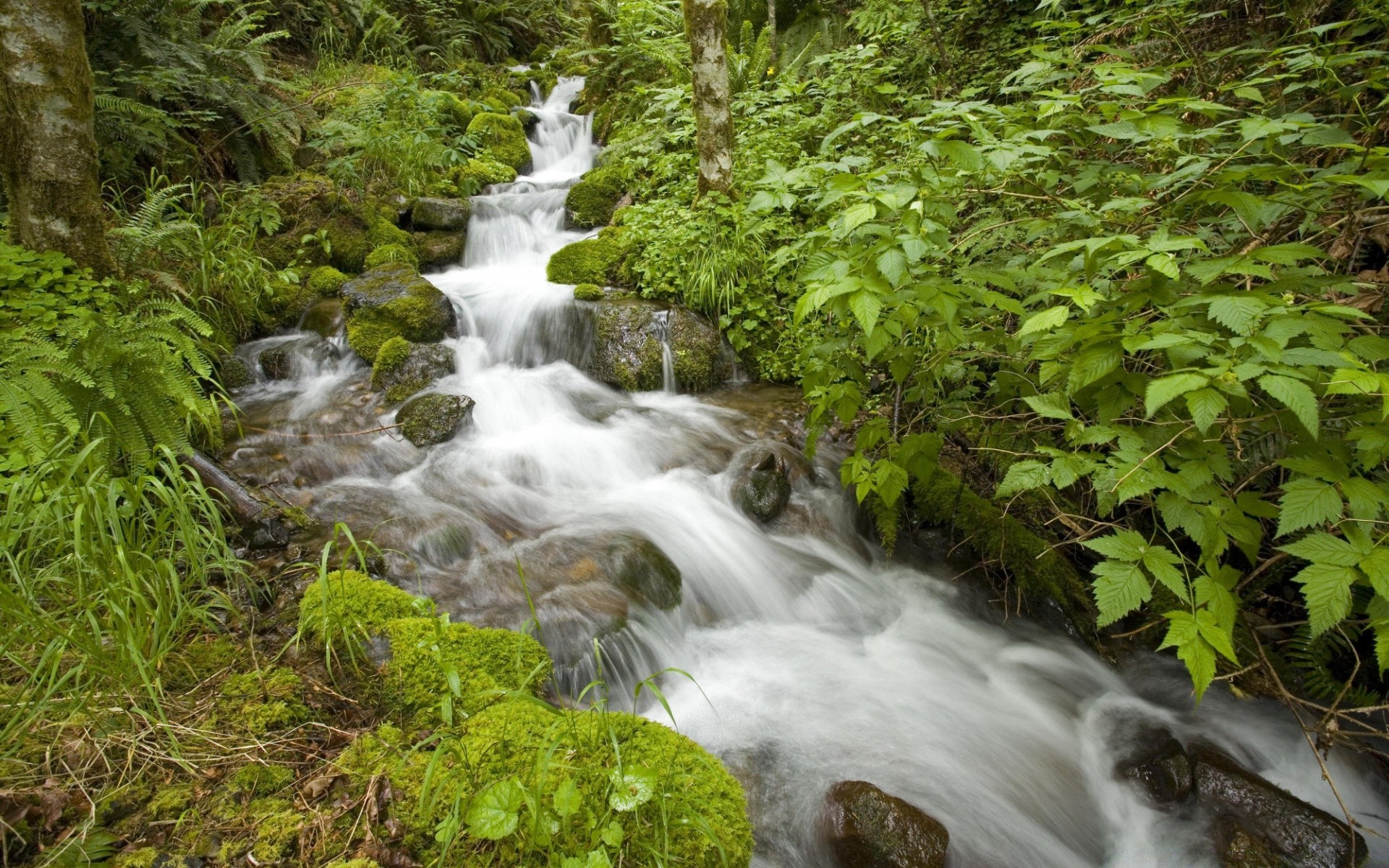 Ein Waldbach unter Bäumen