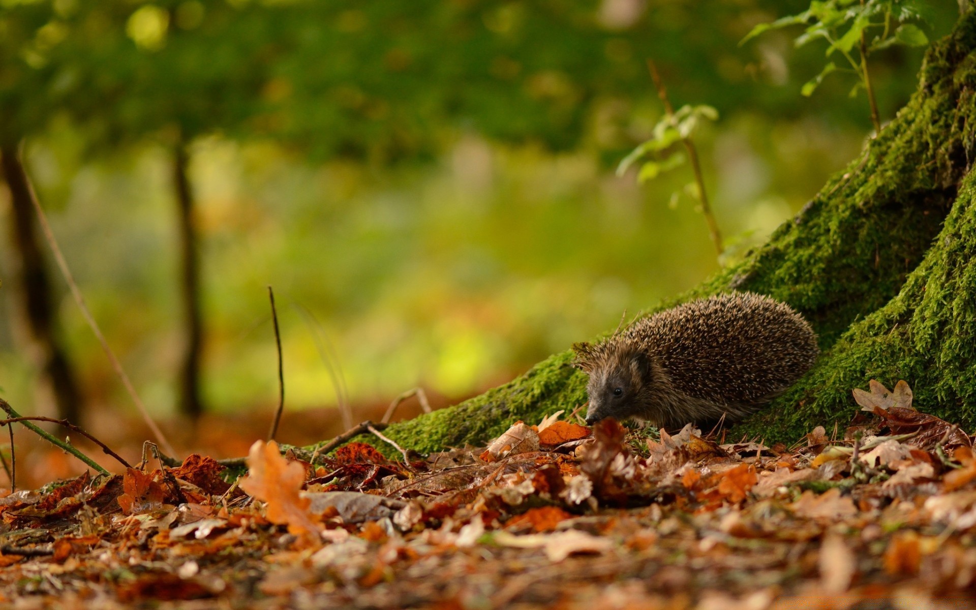 Ein igel unter einem baum in einer herbstlandschaftEin Igel unter einem Baum in einer Herbstlandschaft