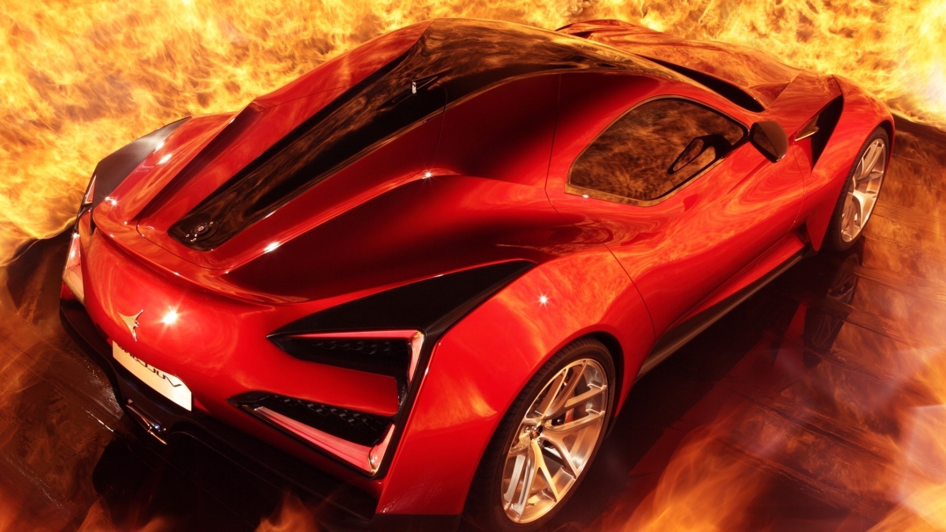 Rotes Sportauto mit eingeschalteten Scheinwerfern