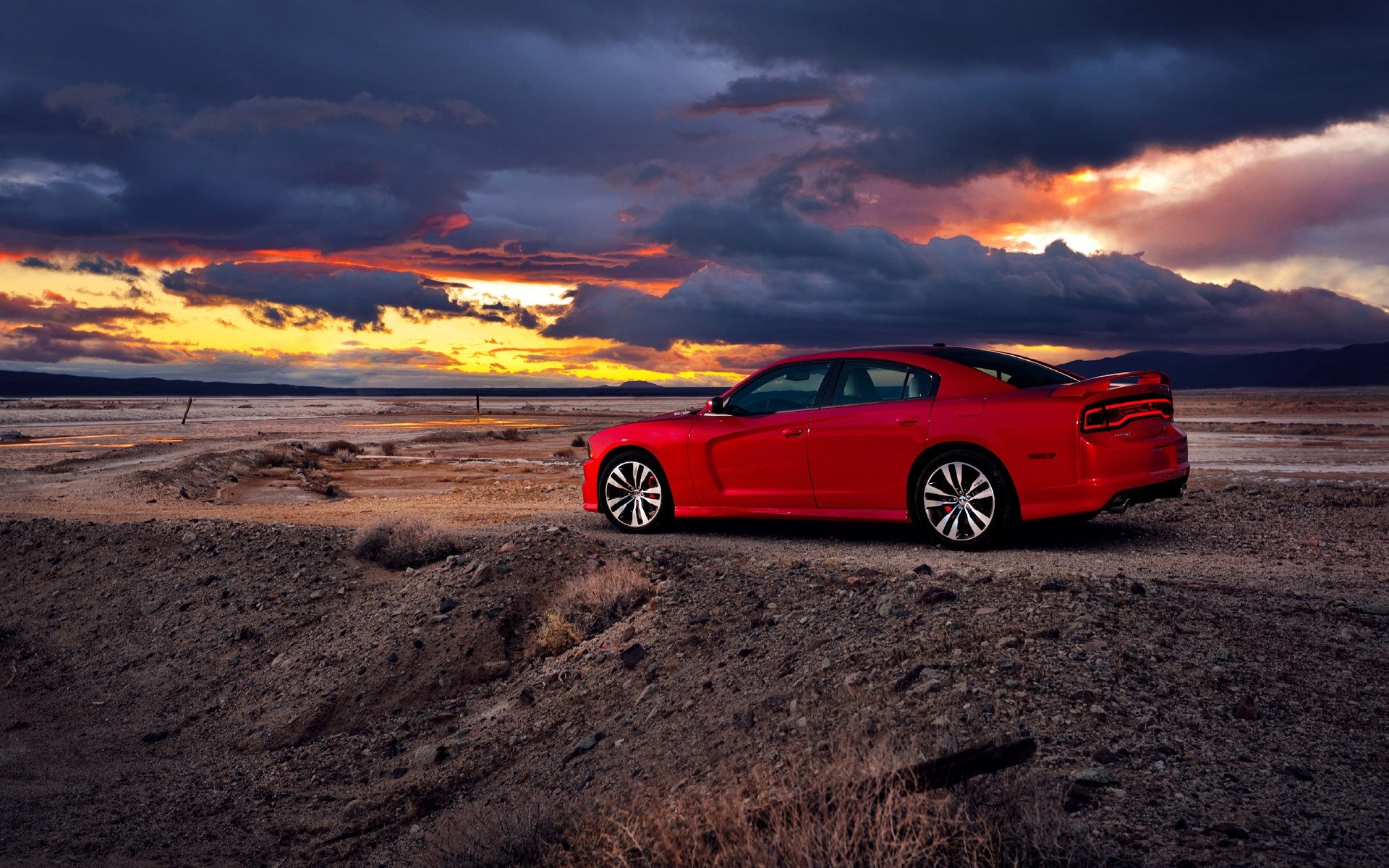 Ein roter Chevrolet steht auf einem Feldweg vor dem Hintergrund der Berge