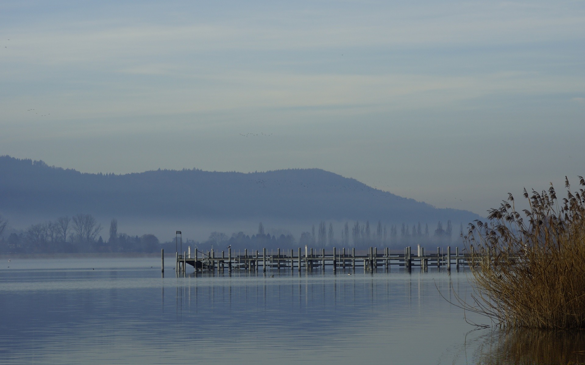 Eine neblige, geheimnisvolle landschaft mit feldern und milder sonneEine neblige, geheimnisvolle Landschaft mit Feldern und milder Sonne
