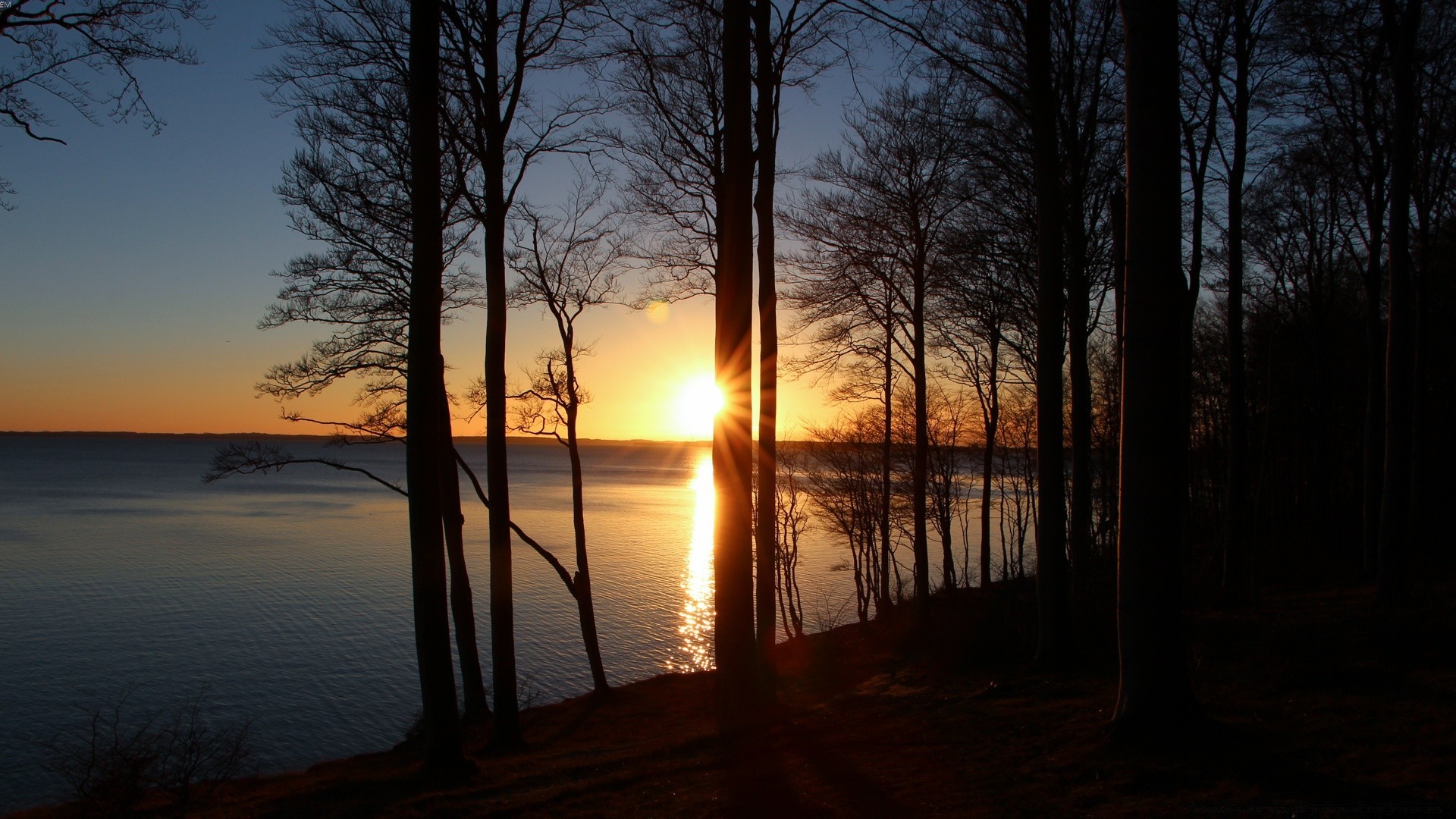 Die untergehende sonne, die hinter einem baum auf einem wasserhintergrund schautDie untergehende Sonne, die hinter einem Baum auf einem Wasserhintergrund schaut