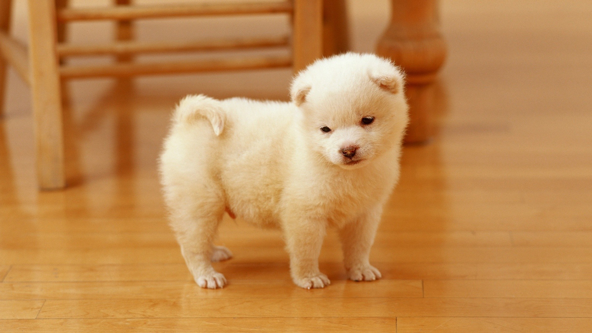 Niedlichen weißen Welpen auf dem Parkett