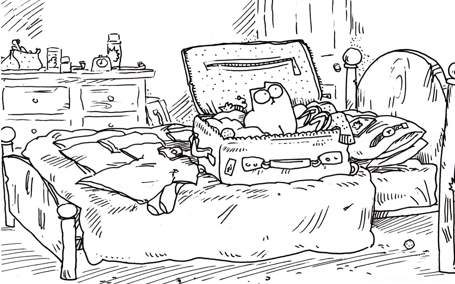 Katze simon im Koffer auf dem Bett, Schwarz-Weiß-Tapete