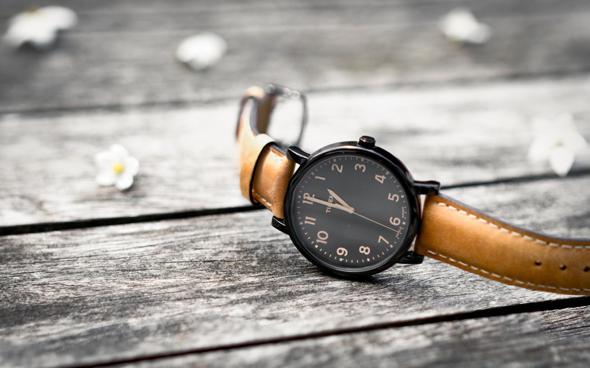 Uhr auf einer Bank mit Blumen