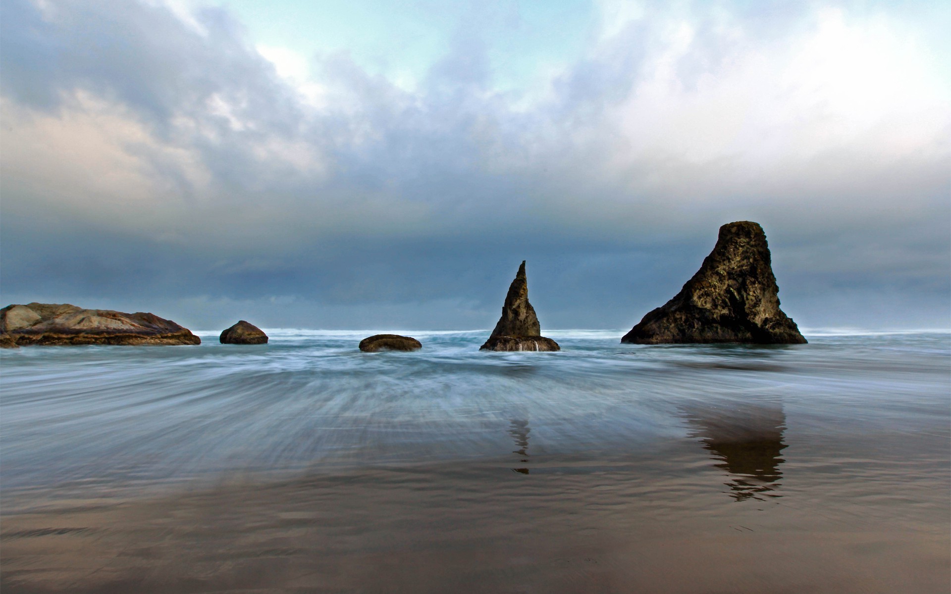 Vier Felsen, die aus der Meeresoberfläche herausragen