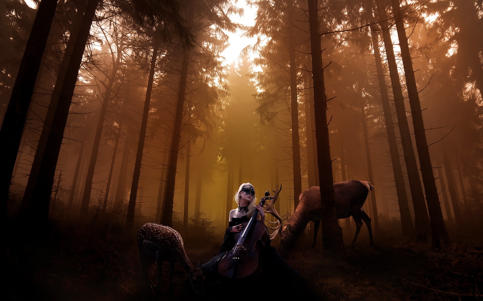 Mädchen im Herbstwald bei Sonnenaufgang
